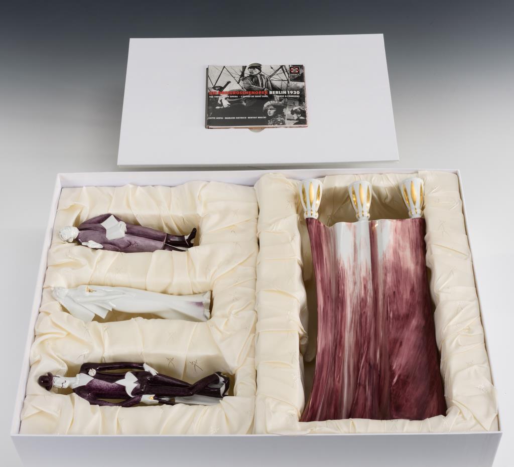 Vorhang als 3-flammiger Leuchter (H 34,5 cm) sowie die Figuren des Mackie, seiner Braut Polly und des Pfarrers Kimball (H 17-22 cm) aus der "Dreigroschenoper" von Bertolt Brecht. Dazu gehört eine CD mit einer historischen Aufnahme der "Dreigroschenoper" aus den 1930er Jahren.