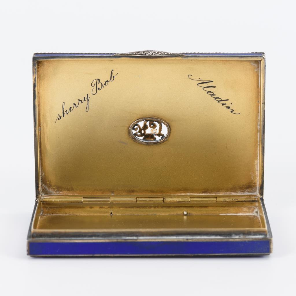 Allseit opak-matt emaillierte Rechteckdose mit à jour gearbeitetem Monogramm auf dem Deckel; im Deckel Gravur "sherry Bob Aladin". Perlstab der Bodenkante fehlt, minimale Alters-/Gebrauchsspuren.