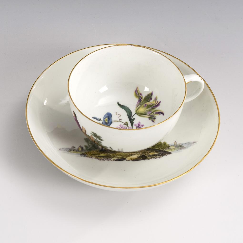 Polychrom bemalt, goldstaffiert. H Tasse 4,5 cm, Ø Untertasse 13 cm.