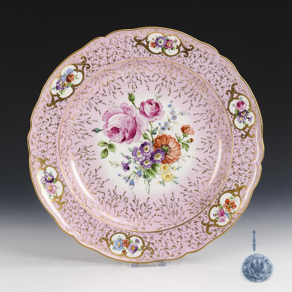 Mehrpassiger Teller mit rosafarbenem, reich floral goldstaffiertem Fond und Blumenbuketts.