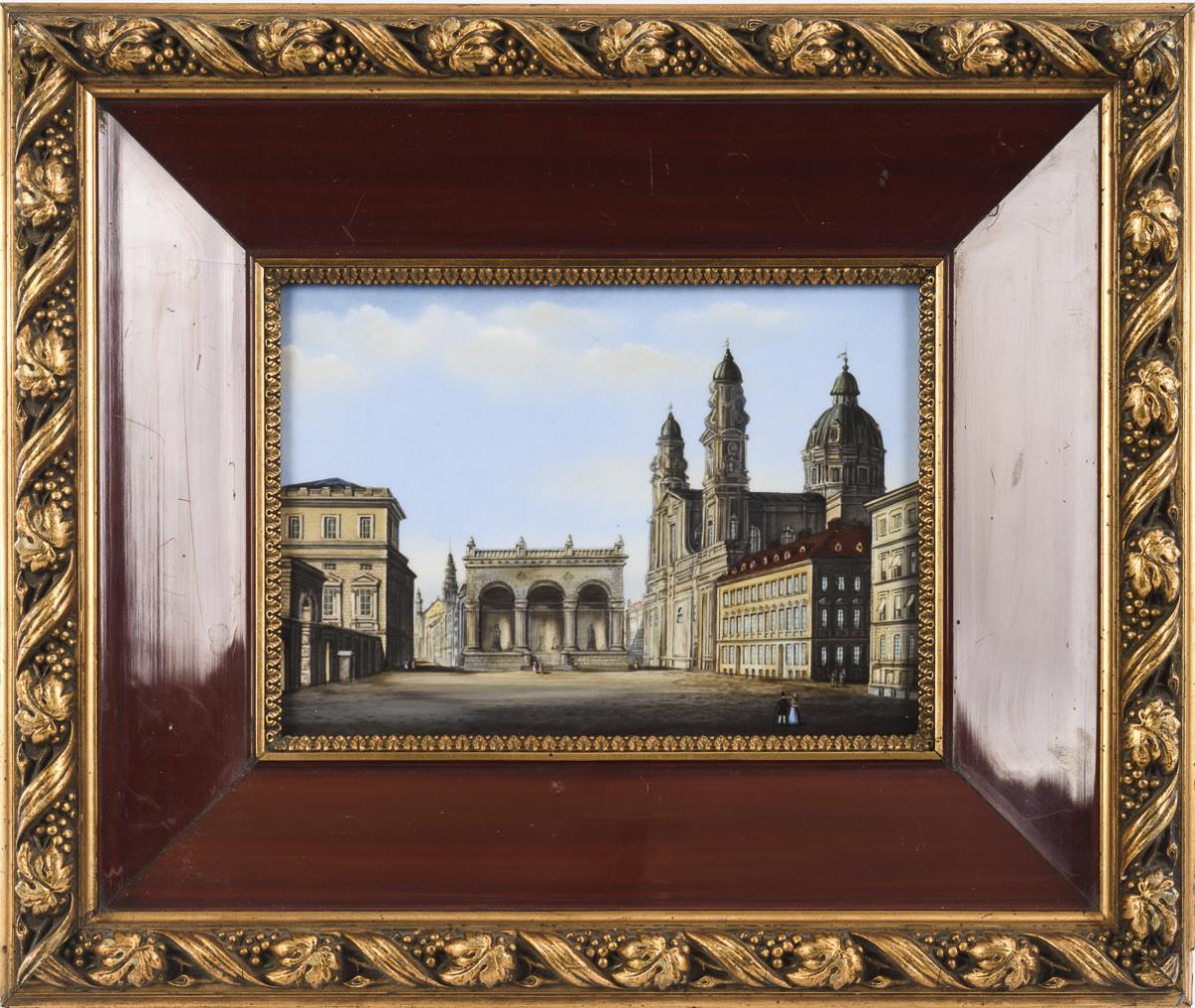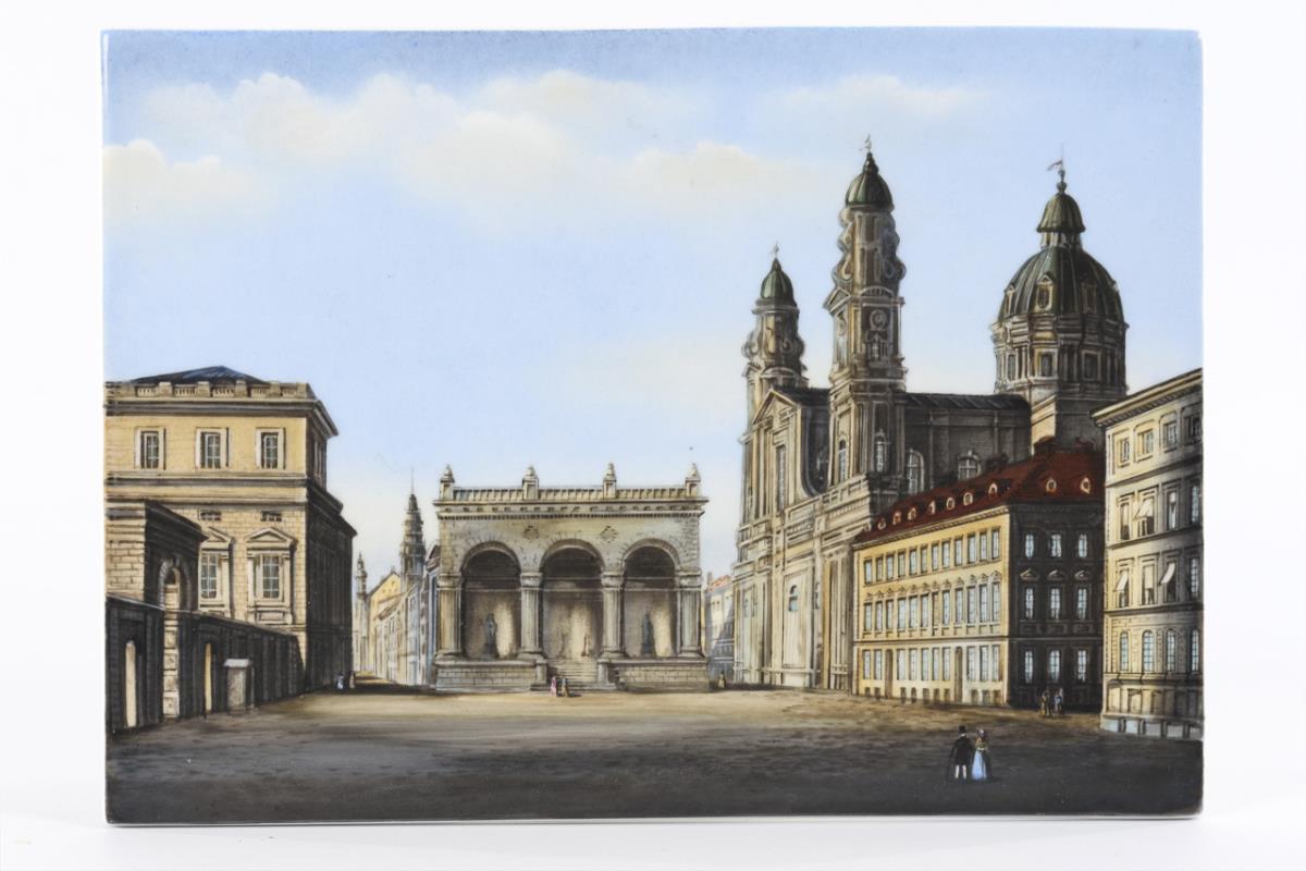 Rechteckige Bildplatte mit der Darstellung des Odeonsplatzes in München.