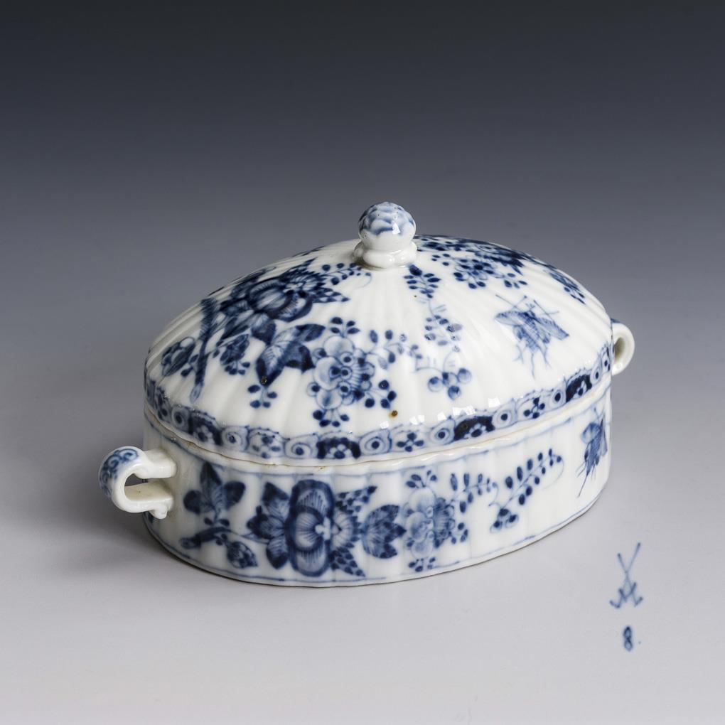Ovale Dose mit vertikal godronierter Wandung, zwei Handhaben und Knaufdeckel. Bemalt mit indianischer Blumen- und Insektenmalerei. Minimale Bestoßung am Deckelrand.