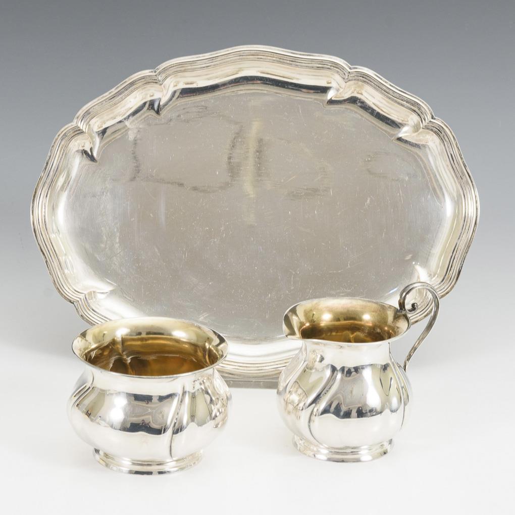 Godroniertes Zuckergefäß und passender Sahnegießer. Auf passend ergänztem Tablett (Wilkens & Söhne, Bremen) mit geschweiftem Profilrand. Leichte Gebrauchsspuren.