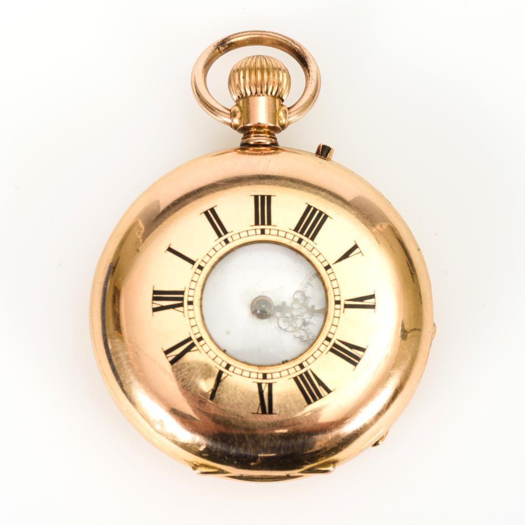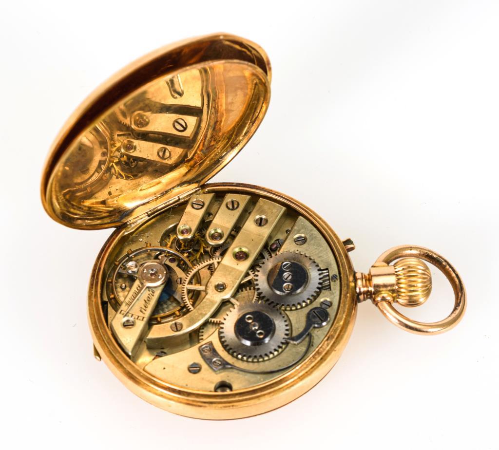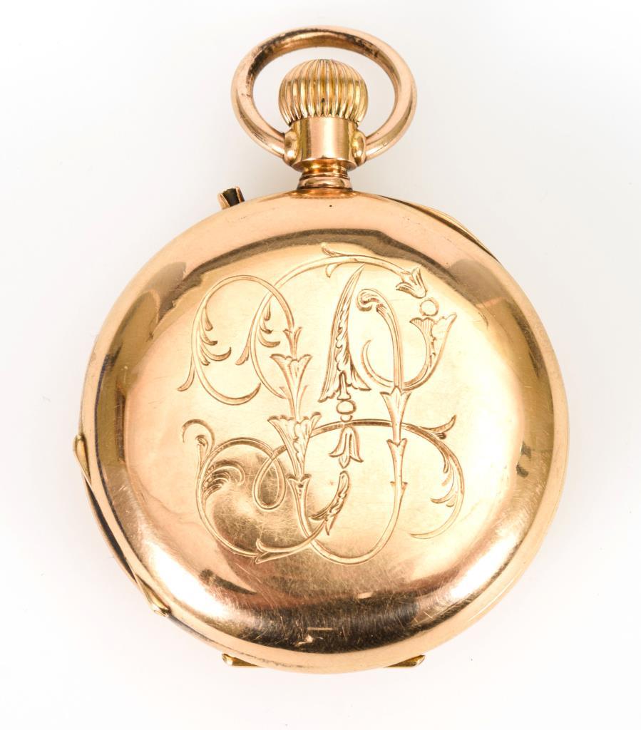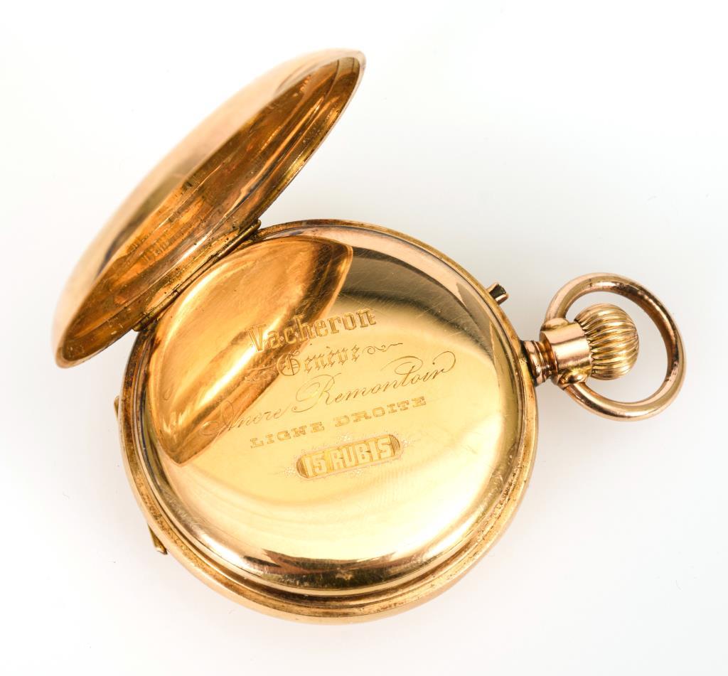 750 GG gepunzt. Halbsavonnette mit glattem Gehäuse, verso ein ligiertes Monogramm, "Vacheron Genève" bezeichneter Staubdeckel aus Gold. Werk läuft.Leichte Gebrauchsspuren.