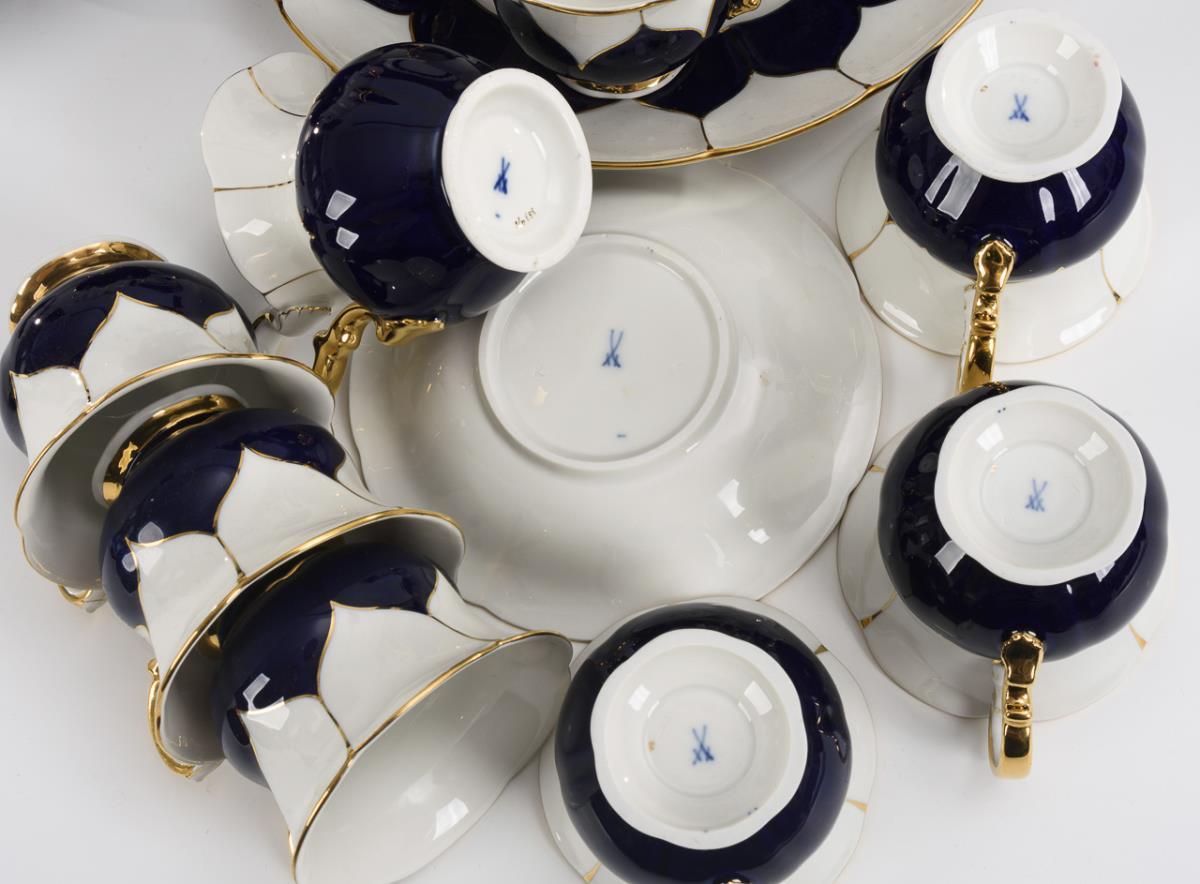 41 Teile. Kaffeekanne (H 25,5 cm), Milchkännchen, Zuckerdose, 12 Tassen, 12 Untertassen, 12 Frühstücksteller und 2 Kuchenteller (Ø 26 cm). Minimale Bereibungen am Kobaltteilfond der Frühstücksteller.