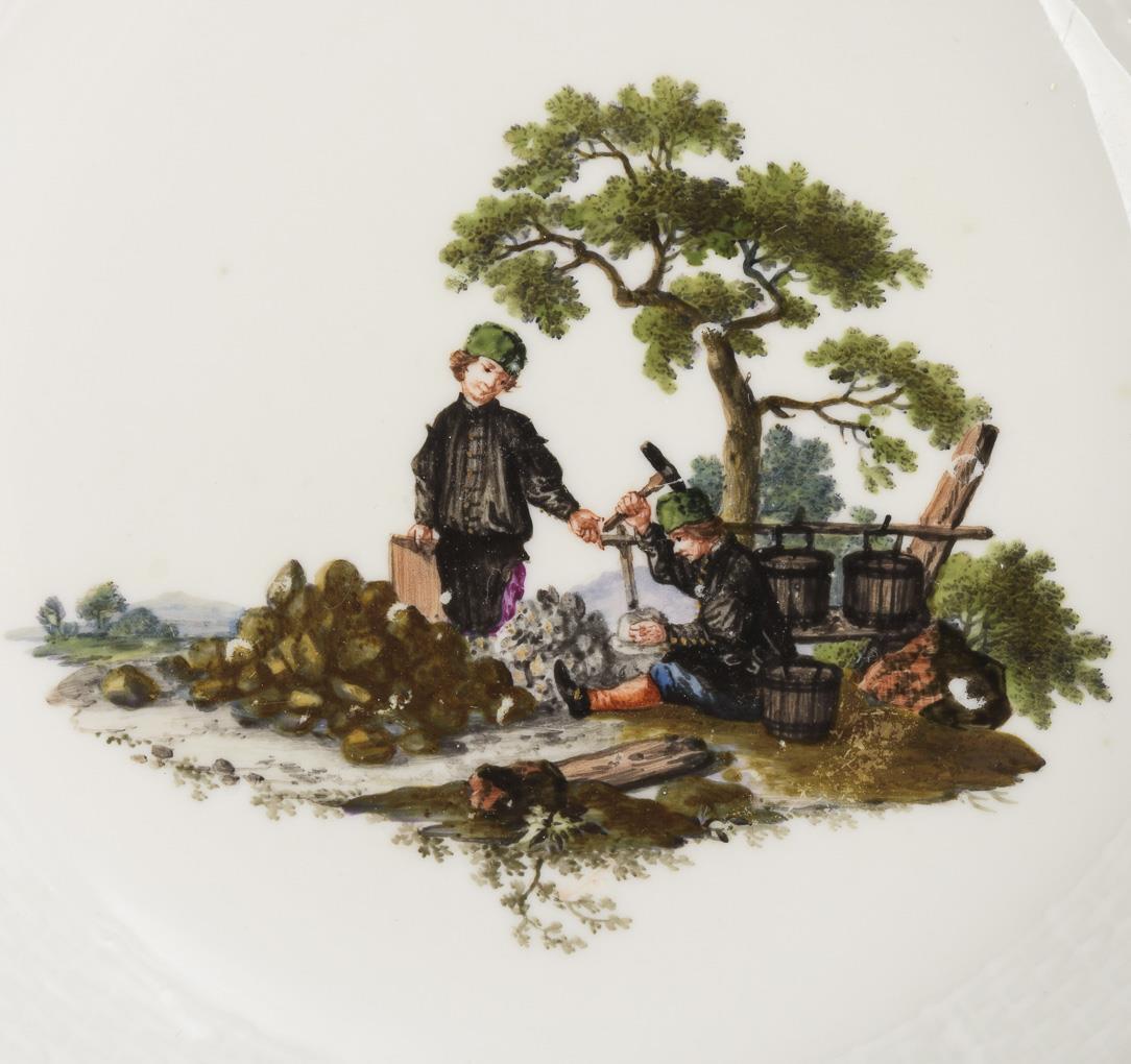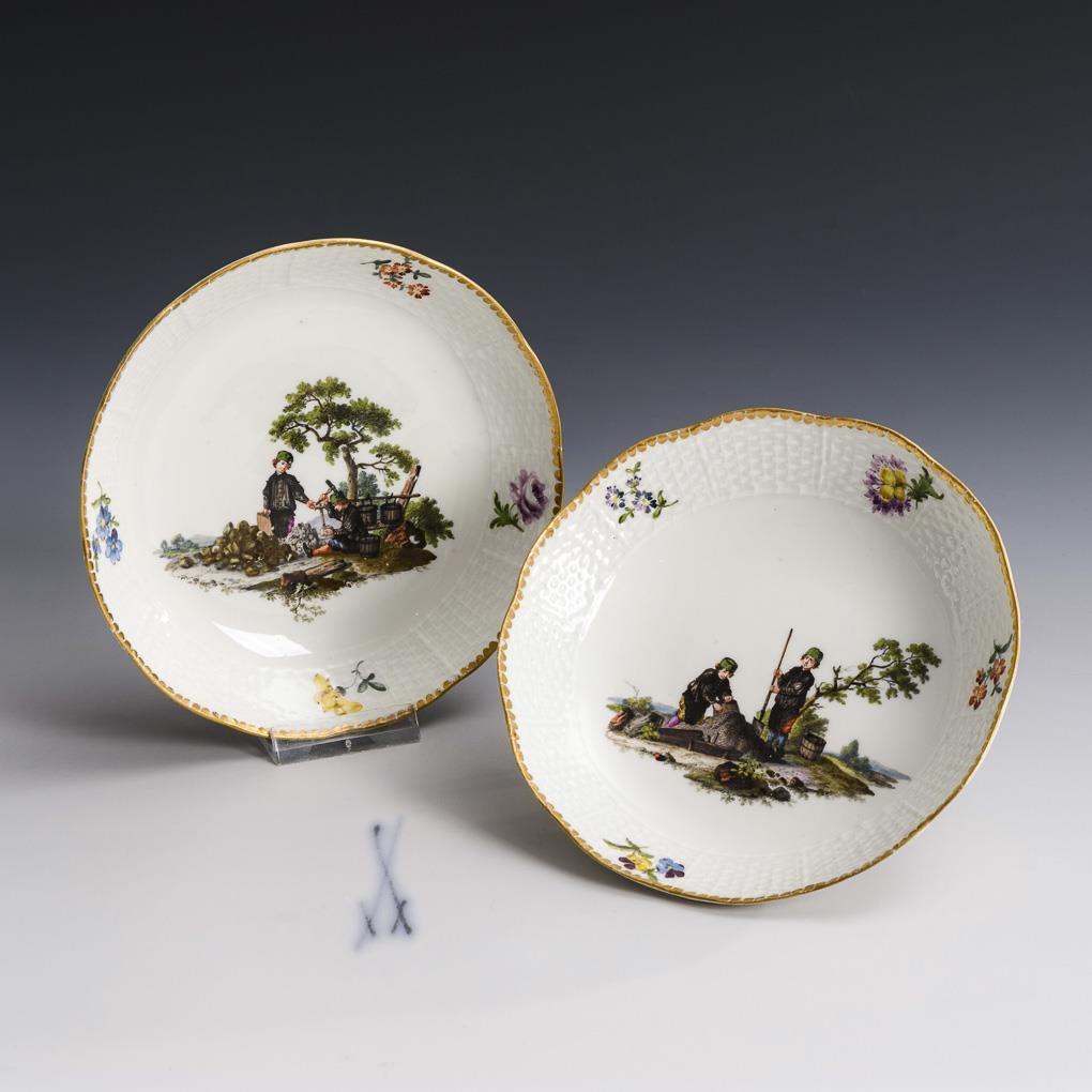 2 barocke Untertassen mit Bergmannsmotiven. Meissen.