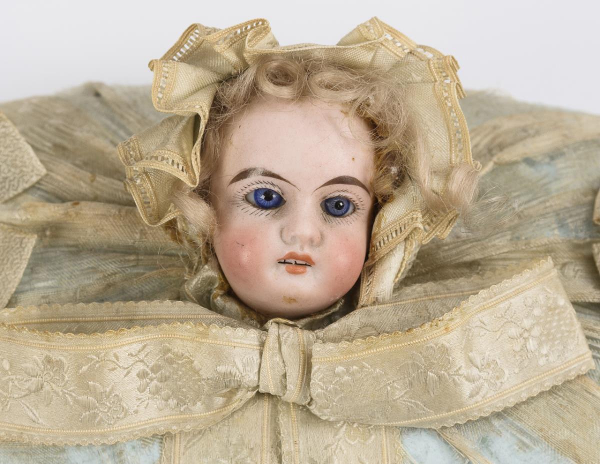 Stoffbezogene Pralinenschachtel mit Porzellanköpfchen. / Geprägter Pappfächer mit Kalender von 1896. / Farbig lithografierter Engelskopf. / 5 einfache Rasseln bzw. Glöckchen. Altersspuren und Defekte.