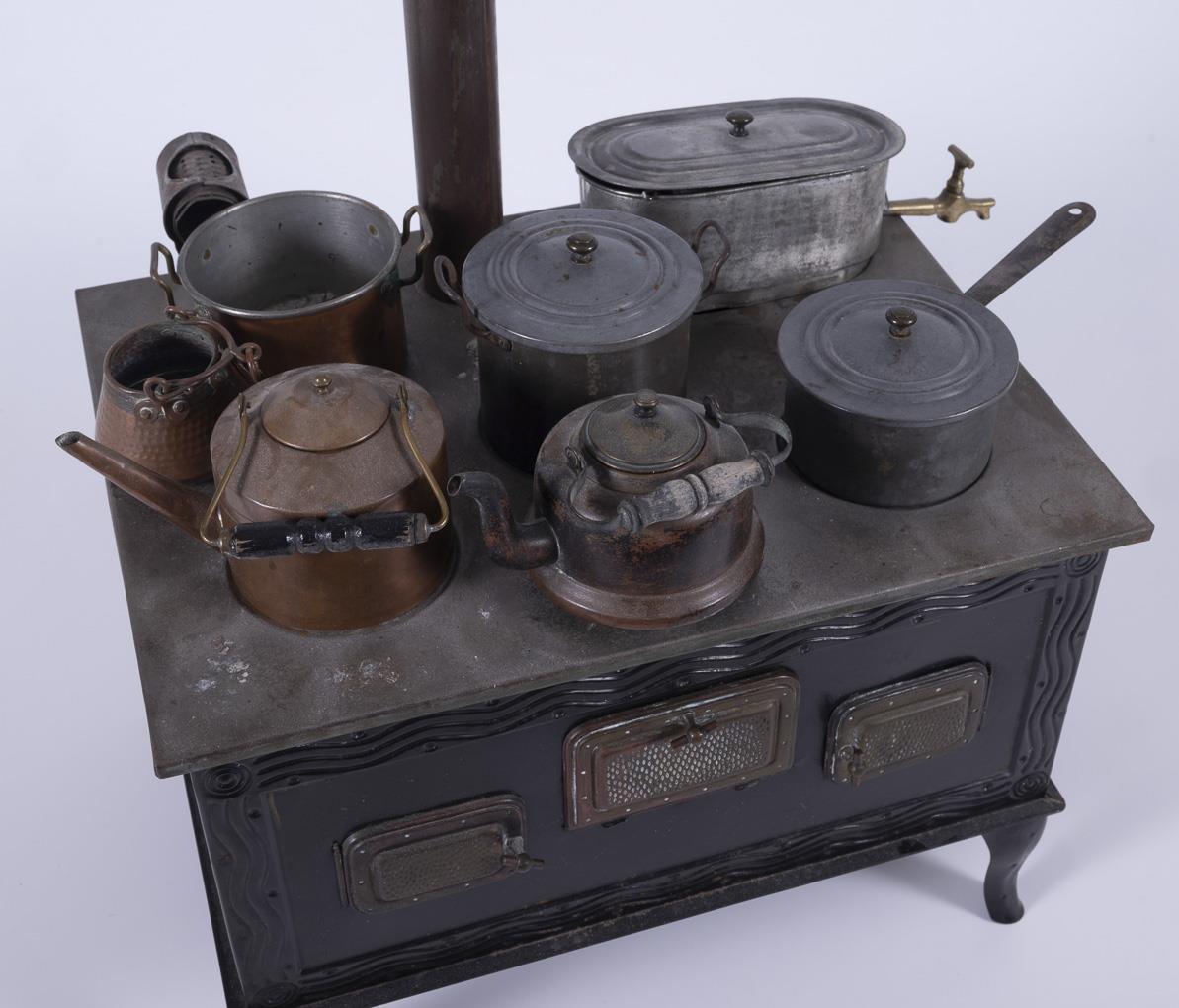Herd mit 3 Klappen, 5 Kochstellen, Backblech und Brenner. Dazu 7 Teile Kochgeschirr und 1 Fleischwolf. Altersspuren.