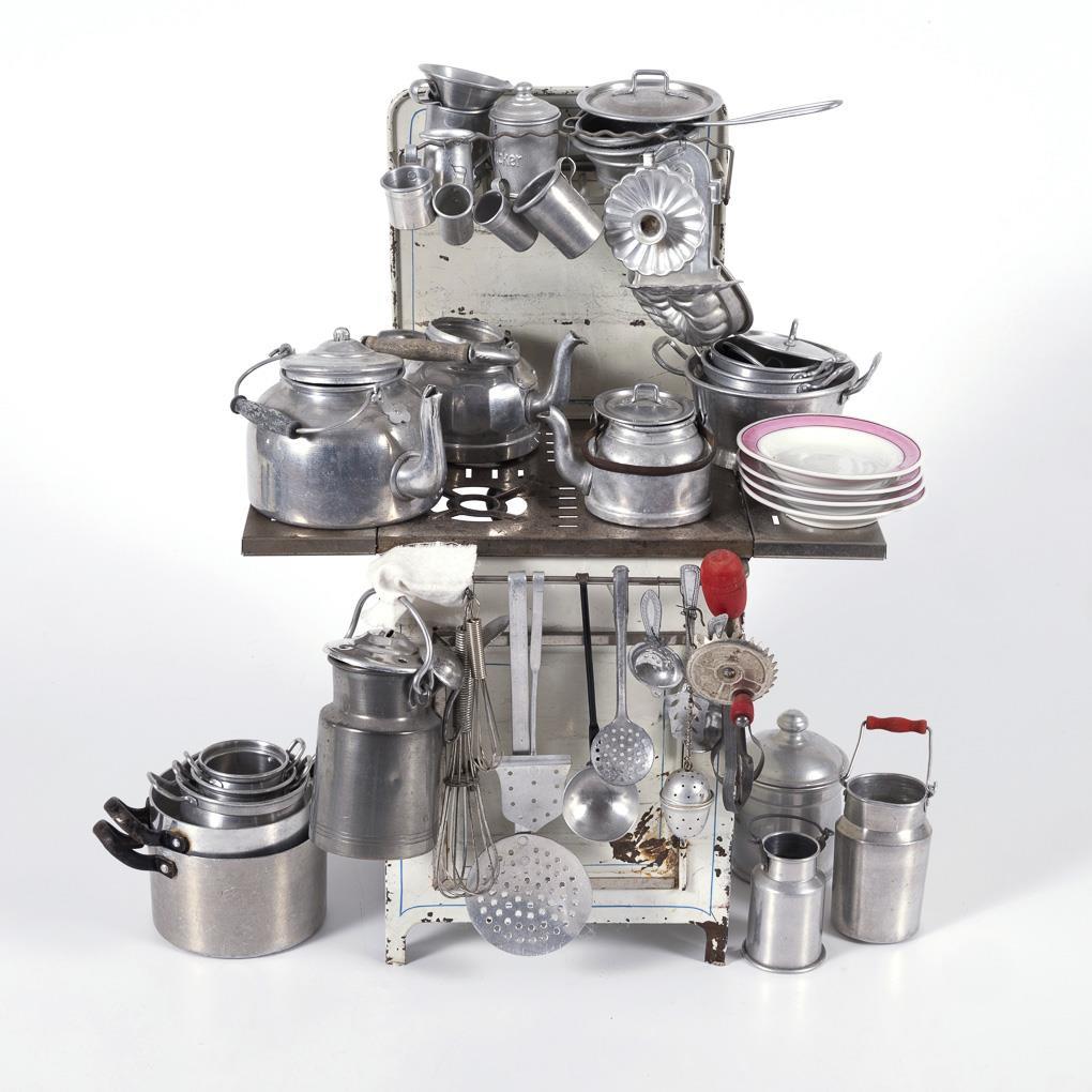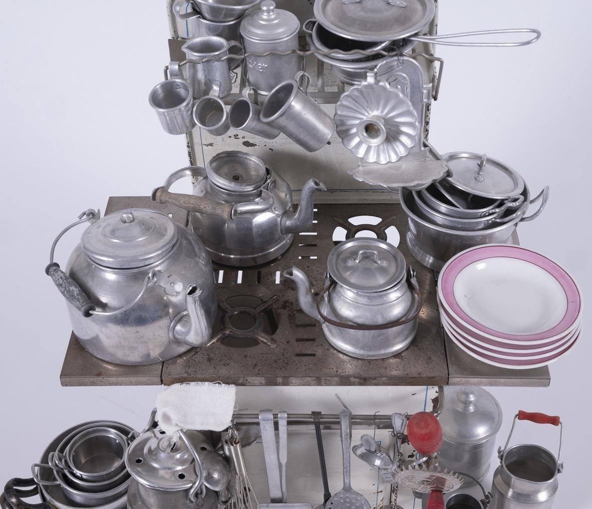 Blechherd mit 4 Kochstellen, Spiritusbrenner, Unterschrank und Aufsatz. Dazu zahlreiches Küchen- und Kochgeschirr aus Aluminium und Porzellan. Altersspuren, Lackdefekte.