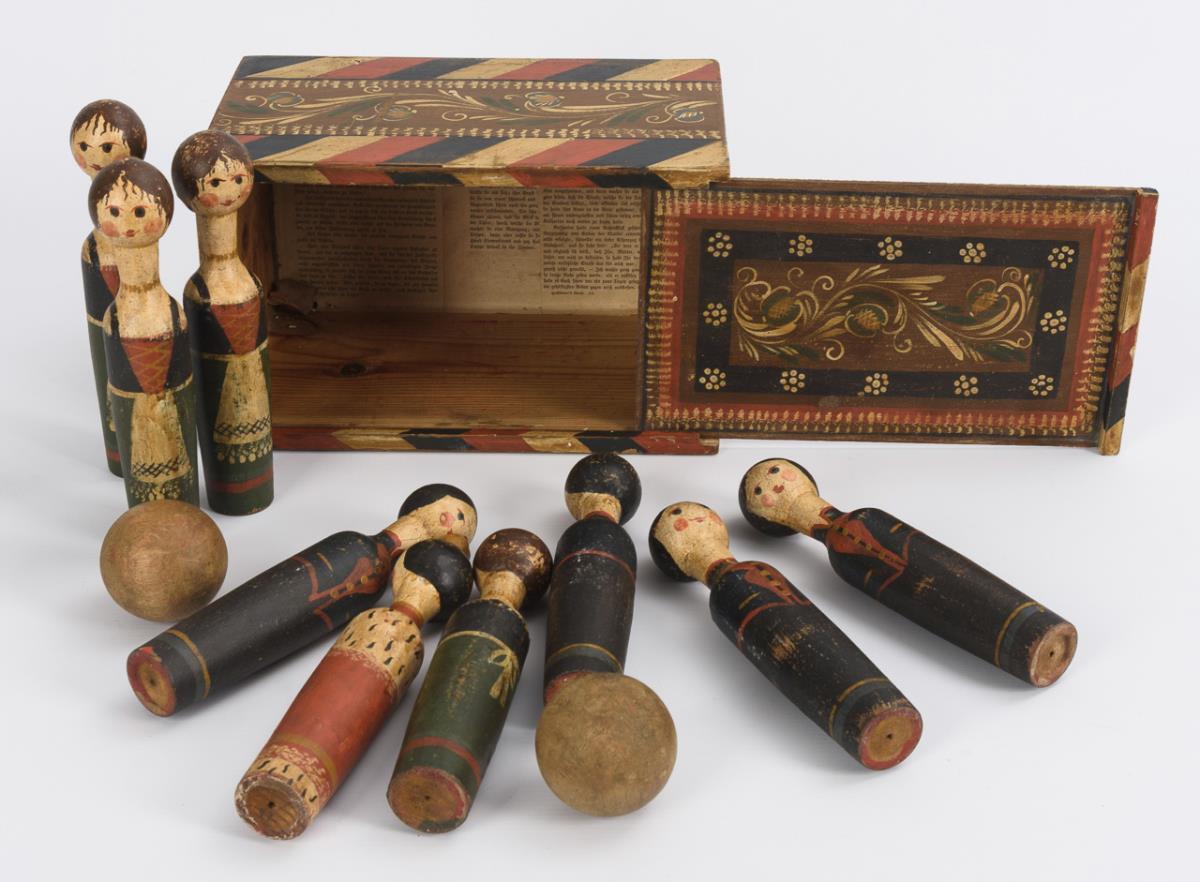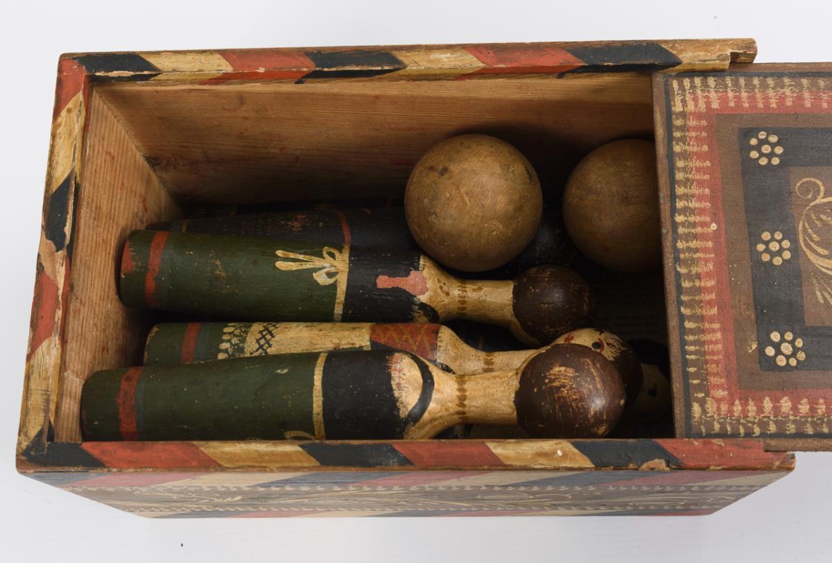 Holzkegelspiel in Kasten mit Bauernmalerei.