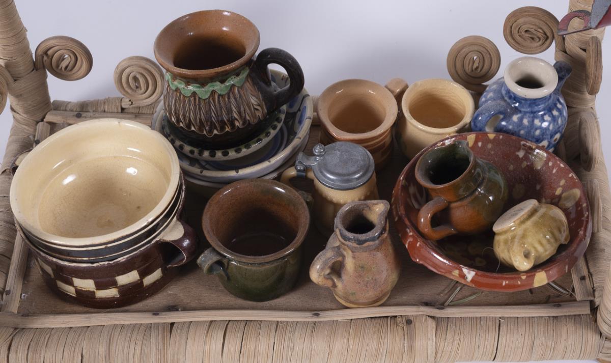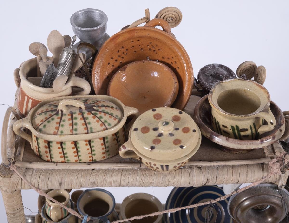 Bastregal mit bäuerlicher Keramik und Zubehör für die Puppenküche aus Emaille und Kupfer. Altersspuren, kleine Bestoßungen.