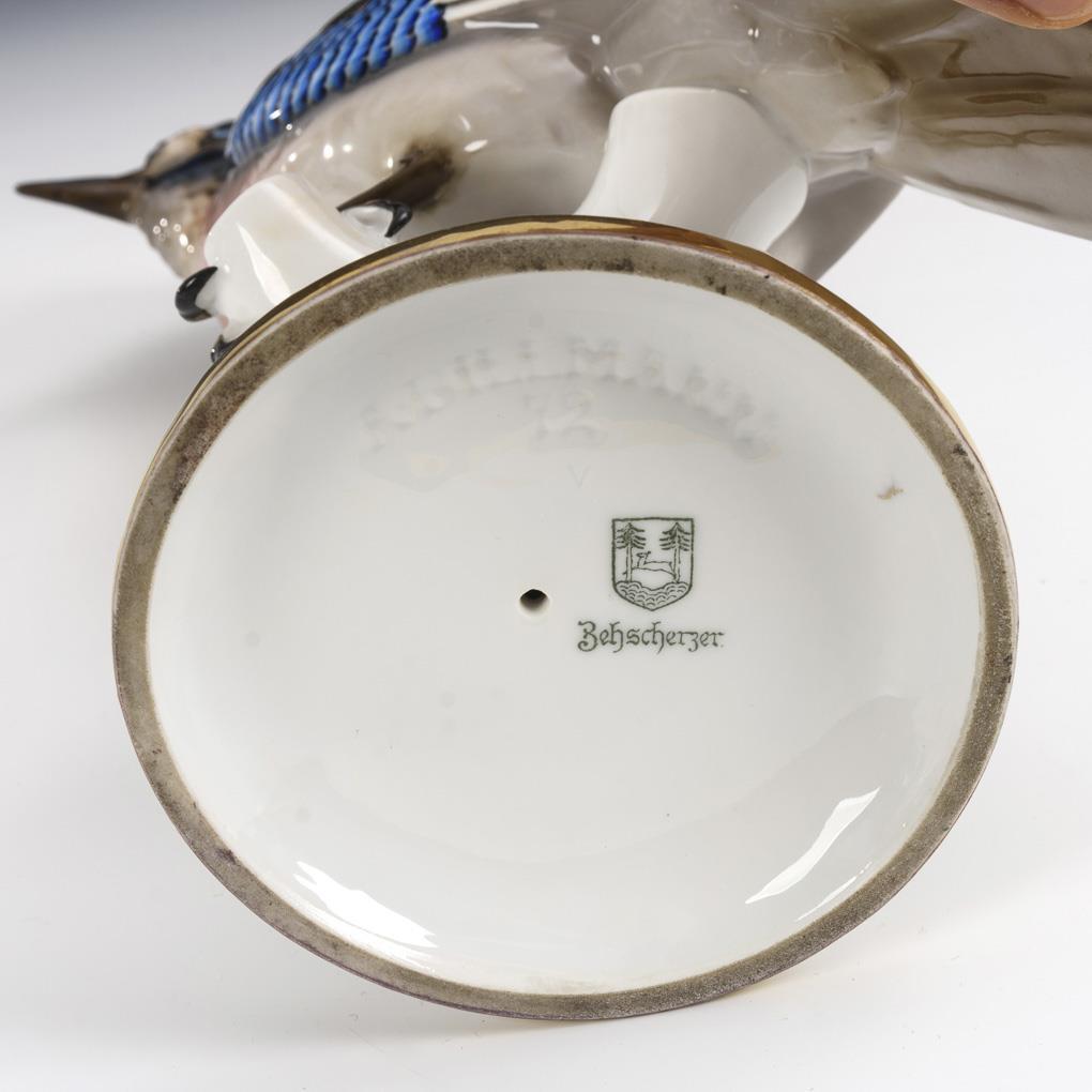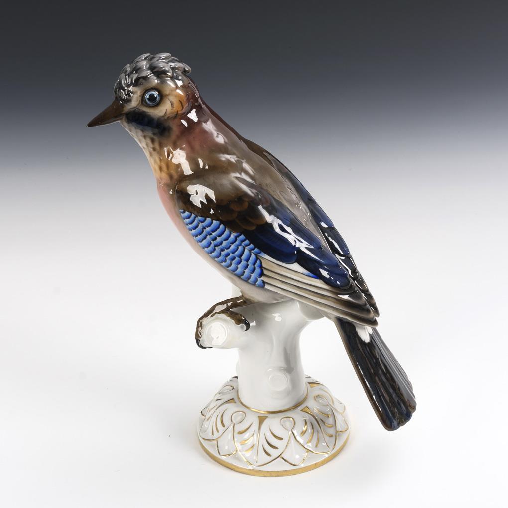 Auf einem hohen Astsockel sitzender Eichelhäher, blattreliefierter Rundfuß. Schnabel restauriert.