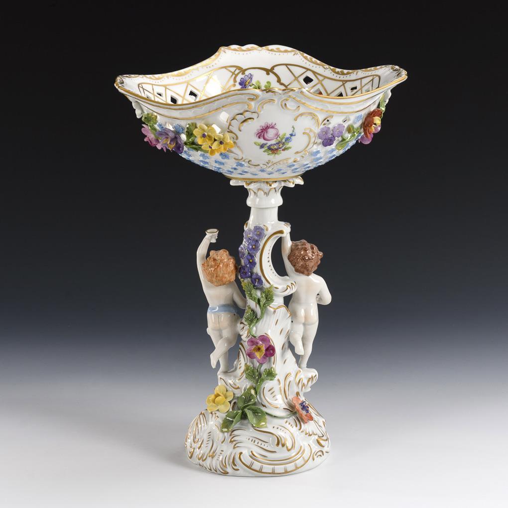 Vierpassige Durchbruchschale mit Blütenbelag und Blumenmalerei, zwei an einem Rocailleschaft stehende Putten, Rocaillefuß. Haarriss am Schalenrand, 1 Blatt bestoßen.