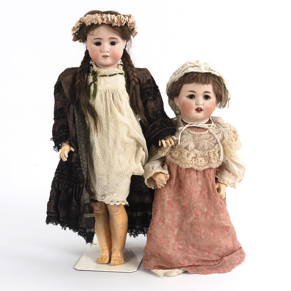 Beide mit Kurbelkopf und braunen Schlafaugen. 1x braune Echthaarperücke, 15-teiliger Gliederkörper und weißes Kleid, brauner Mantel. 1x mittelblonde Mohairperücke, 5-teiliger Sitzbabykörper und rosa Kleid. SQ mit Haarriss am Hinterkopf.