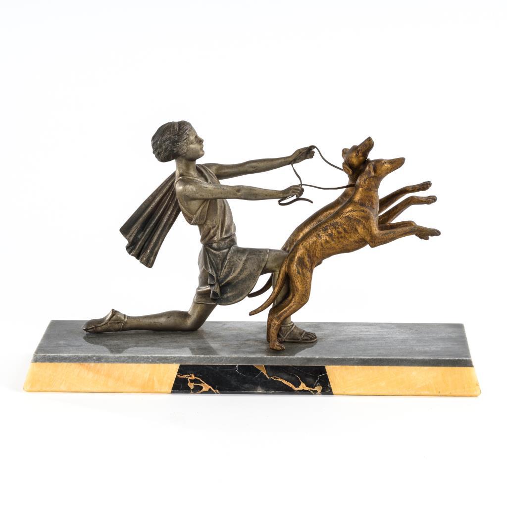 Kniende Jungfrau mit vorwärts drängenden Hunden an den Leinen. Minimale Chips am Sockel.