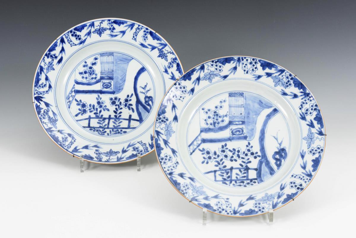 Identische Motive in leicht unterschiedlicher Ausführung. Dezente Musterung der Unterseite. Schmaler brauner Tellerrand. Wandhalterungen. Einer mit Haarriss, einer rückseitig restauriert.