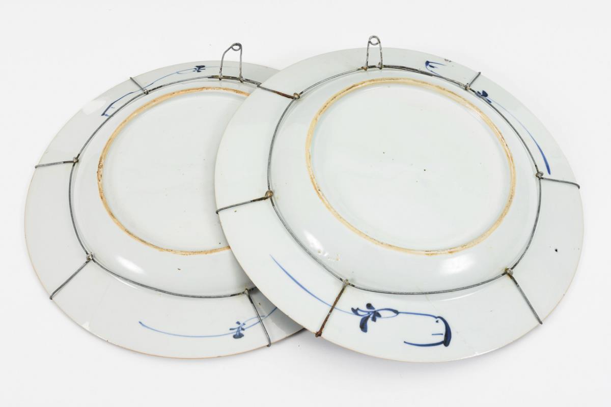 Identische Motive in leicht unterschiedlicher Ausführung. Dezente Musterung der Unterseite. Schmaler brauner Tellerrand. Wandhalterungen. Einer mit Haarriss, einer rückseitig restauriert.