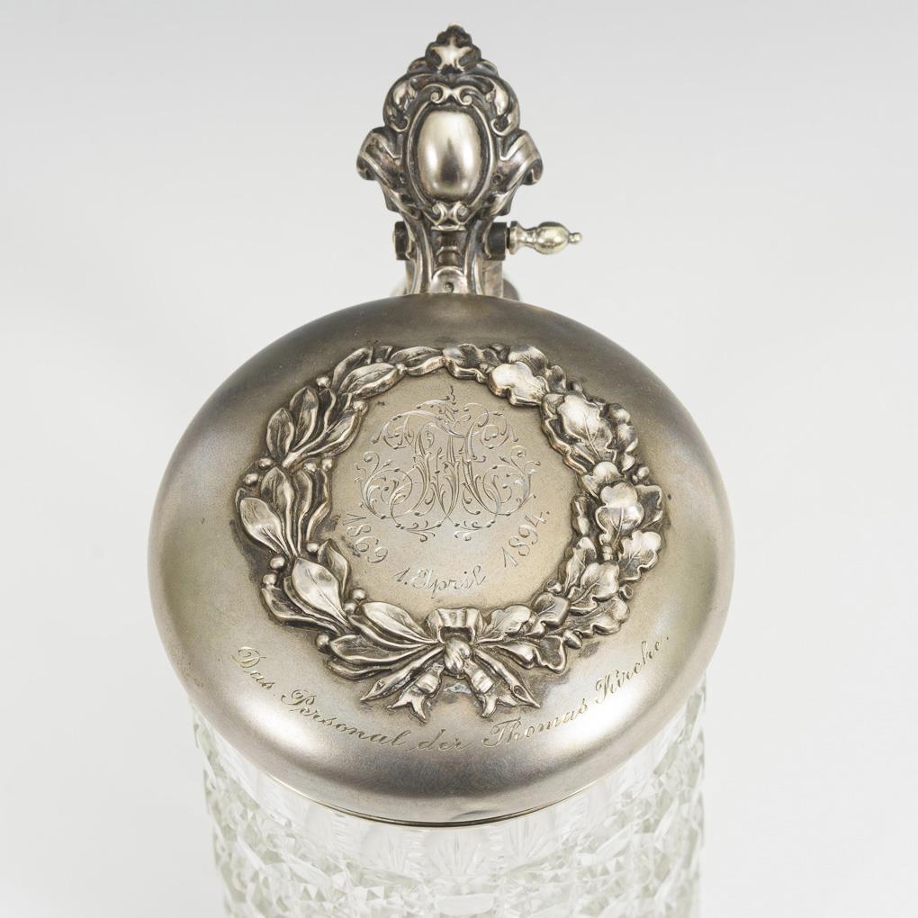 Beschliffener Bierseidel mit reliefiertem und graviertem Deckel "1869 1. April 1894. Das Personal der Thomaskirche". 1 Delle an der Deckelvorderseite.