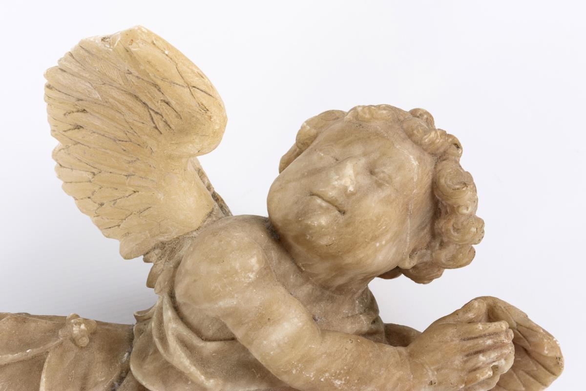 Putto mit zum Gebet erhobenen Händen und Blick zum Betrachter. Nahezu vollplastische Arbeit mit ebener Rückseite und 2 Bohrlöchern für die Montage. Ein Flügel ergänzt, Fehlstellen und Bestoßungen.