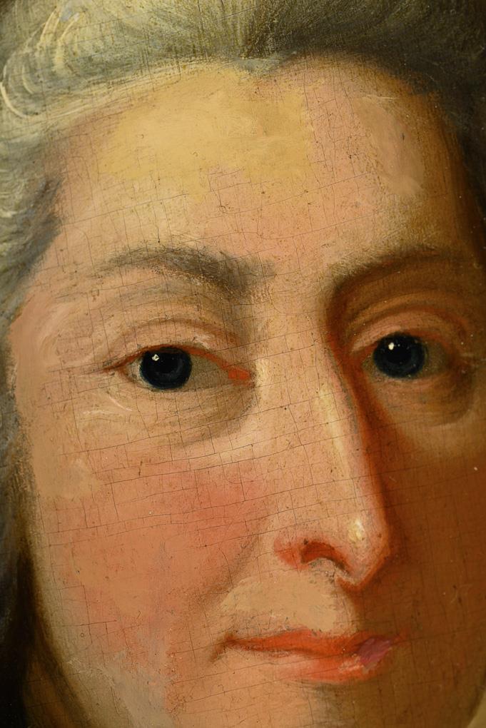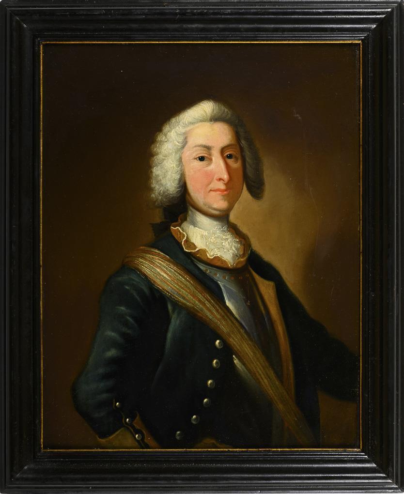 Porträt eines jungen Mannes mit Zopfperücke und im Gehrock mit Harnisch. Leichte Altersspuren.