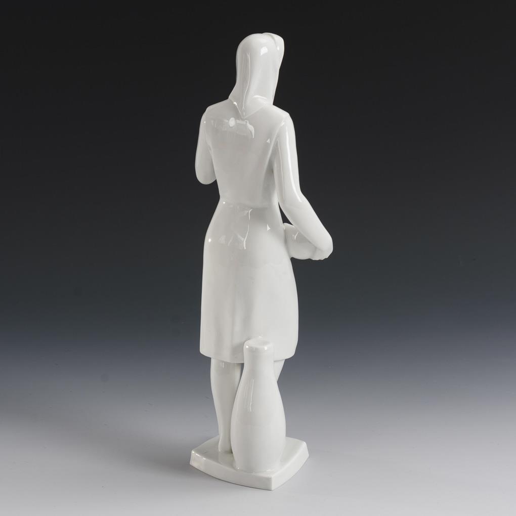 Stehende junge Frau mit Schale und Milchkanne.