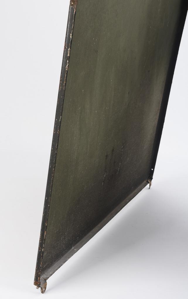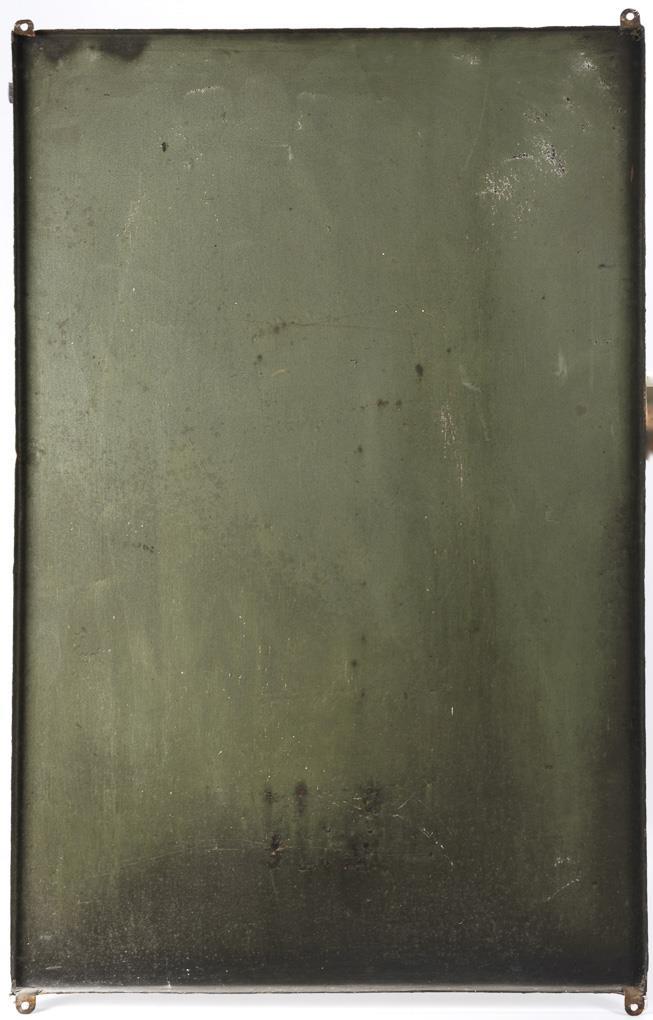 Eisenblech mit abgekanteten Seiten, 4 Ösen. mehrfarbig emailliert (schabloniert). 117 x 77 cm (ohne Ösen).