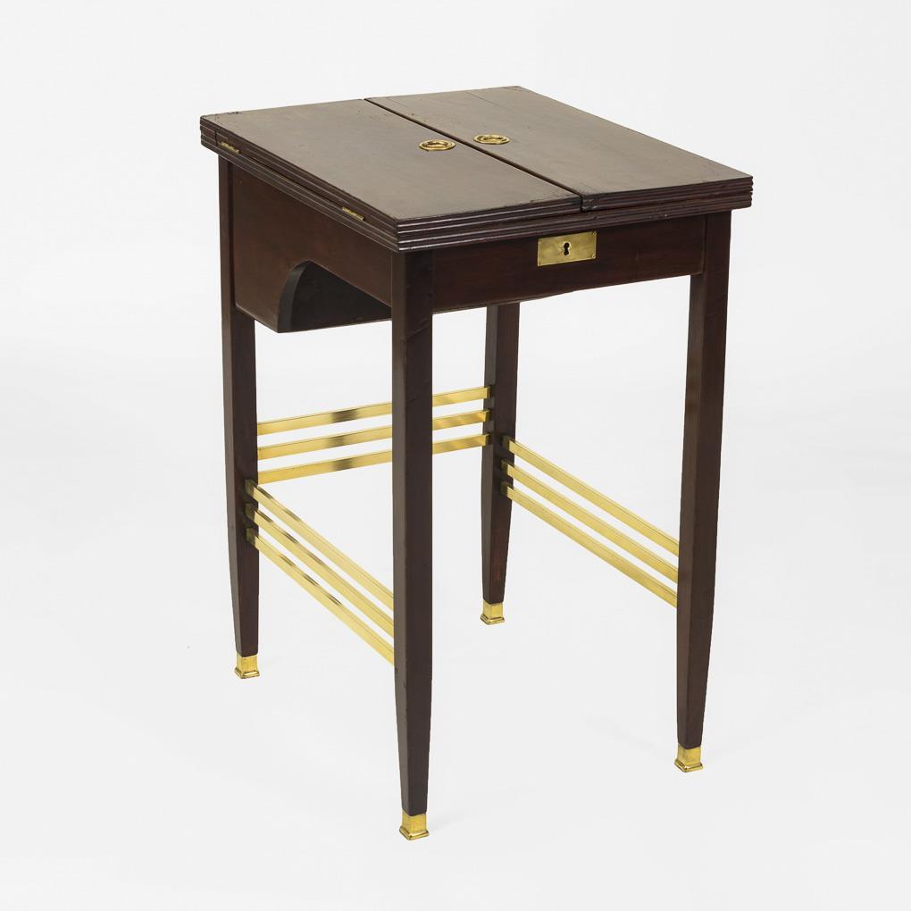 Zierlicher Schreibtisch mit 2-seitig aufklappbarer Platte, auf 4 messingverstrebten Pfeilerbeinen, mit Zargenfach; klappbare samtbezogene Schreibklappe (= Deckel des abschließbaren Zargenfaches), dahinter ein versenkbarer Stifteköcher, äußere Platten mit Lederapplikation mit Steckfächern und Kalender. Restauriert, Alters-/Gebrauchsspuren.