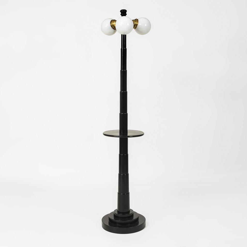 3-flammige Stehlampe mit teleskopartigem Mittelschaft, Ablagefläche und getrepptem Rundsockel; Messingring mit 3 glockenförmigen Lampenhalterungen und Kugelschirmen. Wohnfertig restauriert.