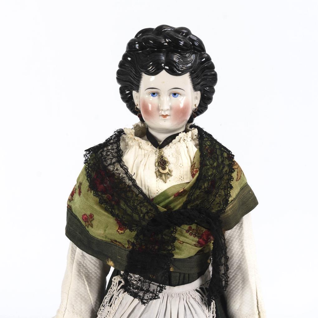 Glasierter Brustkopf, gemalte blaue Augen, Ohrringe, schwarze Haare mit modellierter Flechtfrisur. Lederkörper mit Splintgelenken, Unterarme aus Biskuit. Im Trachtenstil bekleidet, Unterwäsche alt. Keine Defekte sichtbar.