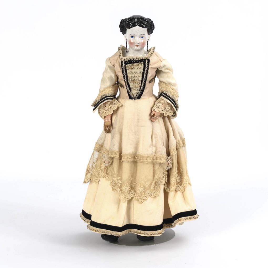 Biedermeierpuppe mit glasiertem Brustkopf.