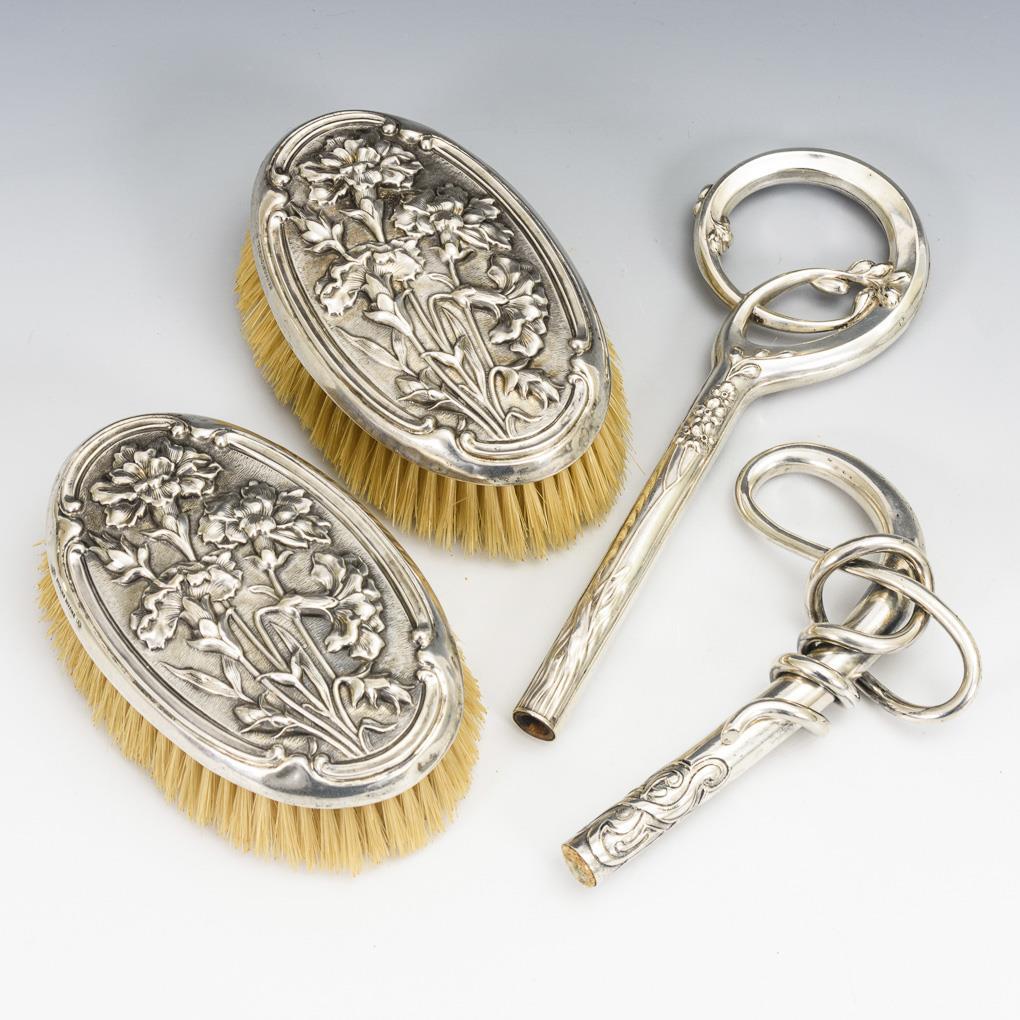 2 kunstvolle Stockgriffe und 2 Bürsten mit floral reliefierter Rückseite. Gebrauchsspuren.