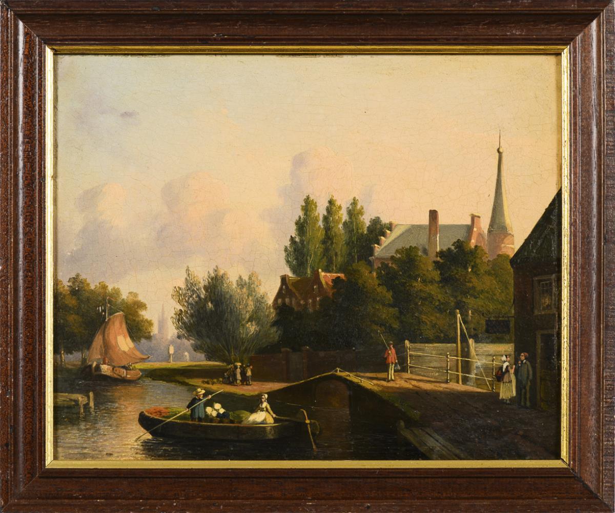 Warmes Sonnenlicht über der idyllischen Stadt mit Staffagefiguren im Boot und auf dem Uferweg. Minimale Altersspuren.
