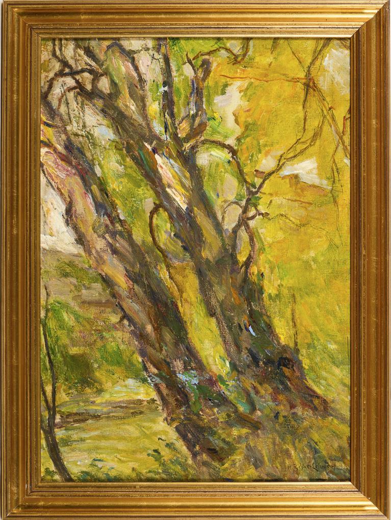 Spätimpressionistisch gemalte Bäume an einem Hang im Sonnenschein.