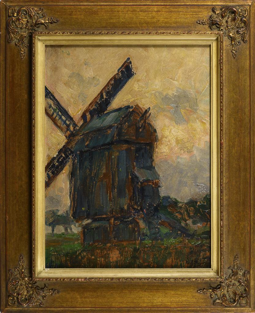 Die Mühle in ebener Landschaft unter wolkigem Himmel.