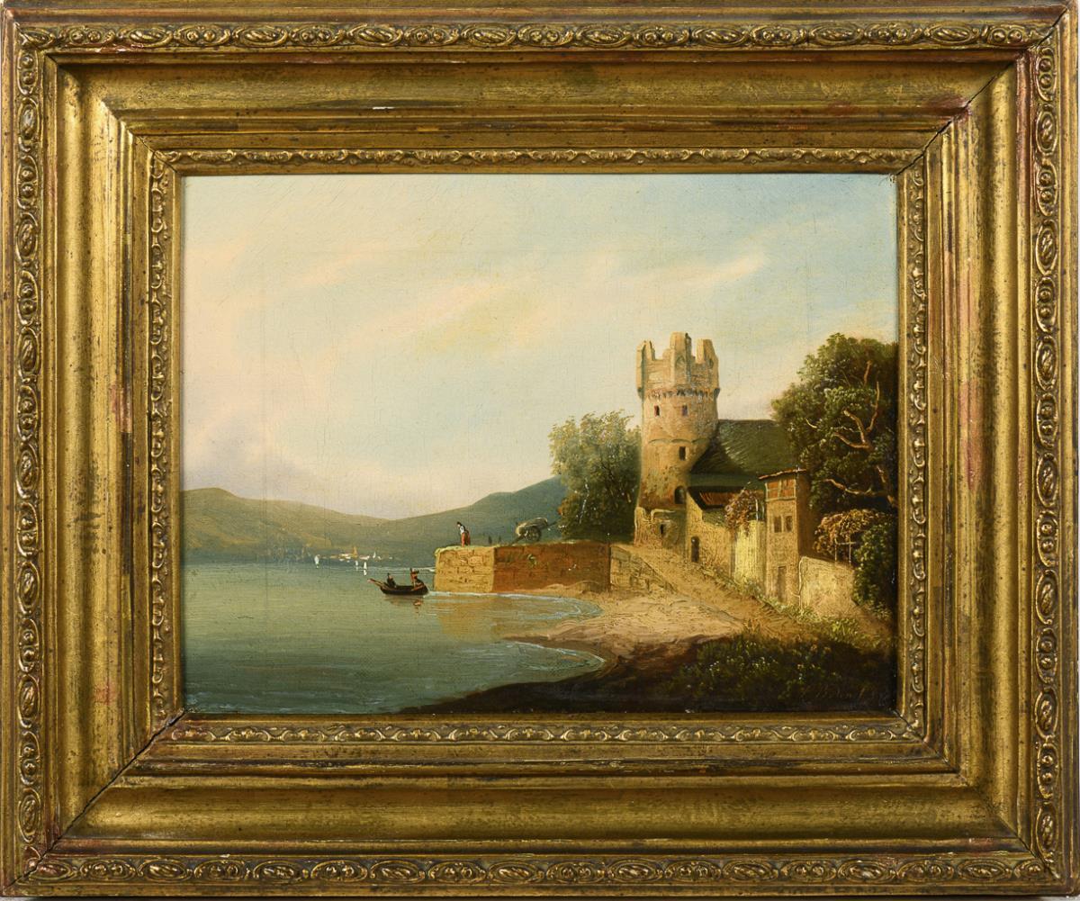 Alter Wehrturm am Ufer mit Staffagefiguren im Sonnenschein. Leichte Altersspuren.