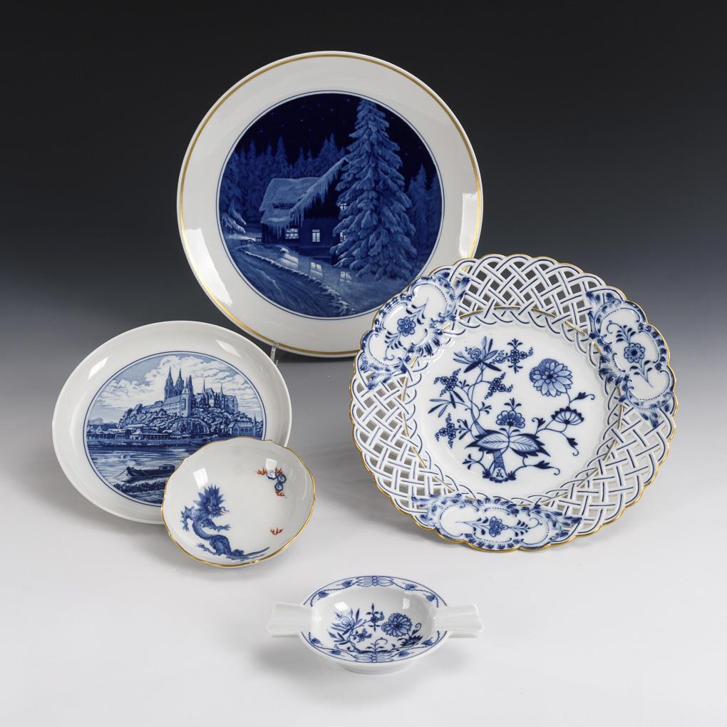 Zwiebelmuster-Durchbruchteller (Ø 24 cm), Zwiebelmuster-Ascher (L 14 cm), Weihnachtsteller (Ø 25,5 cm), Ansichtenteller Albrechtsburg Meissen (Ø 17,5 cm) und 1 Untertasse mit dem Dekor "Blauer Drache" (Ø 10,5 cm).