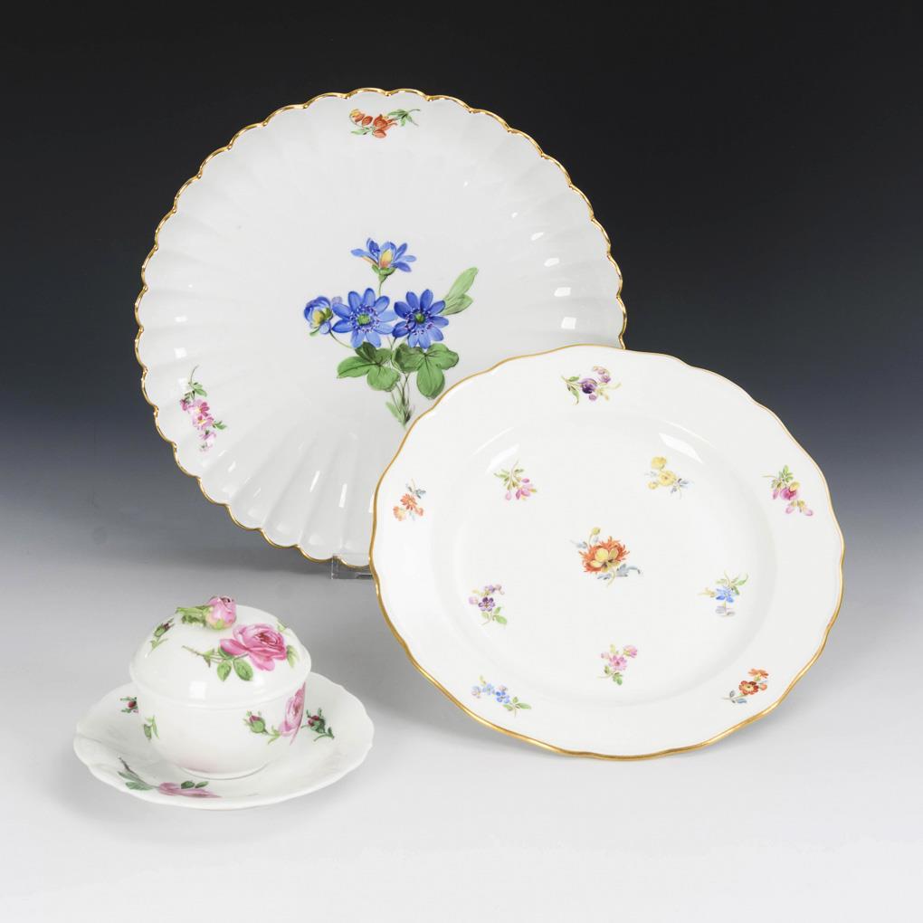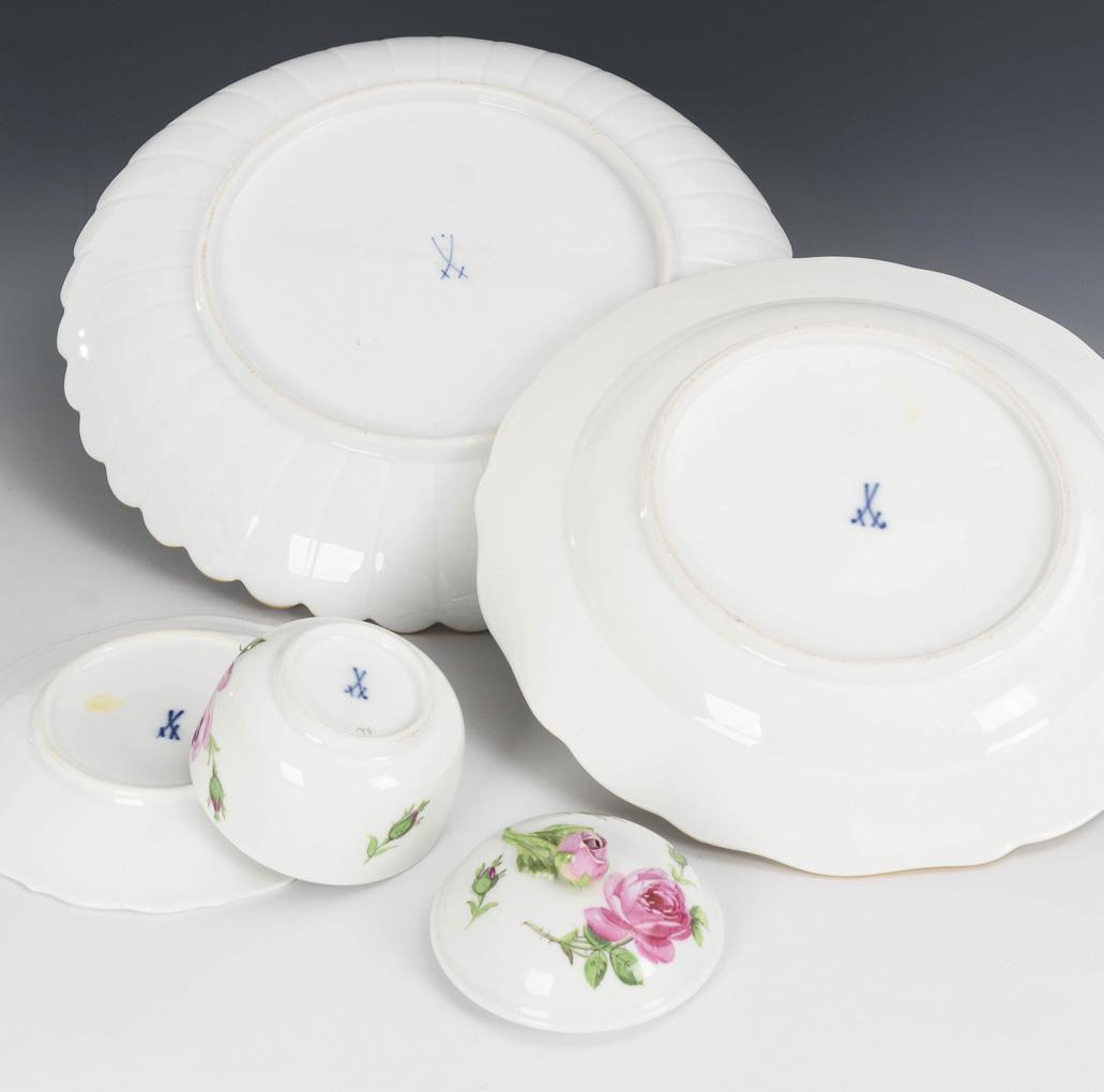 Fächerplatte, Teller, Zuckerdose und Untertasse. Meissen.
