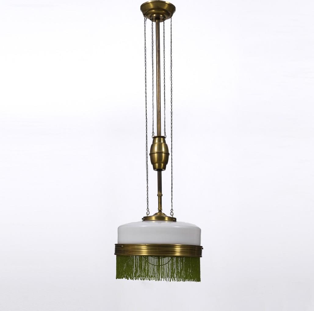 1-flammige, höhenverstellbare Hängelampe mit Mittelstab und Tellerbaldachin, Glasschirm mit Messingring und grünem Perlbehang; individuell höhenverstellbar durch Doppelzug-Pendel. Leichte Alters-/Gebrauchsspuren, Glasrand mit kleinen Chips, wenige Perlen fehlen.