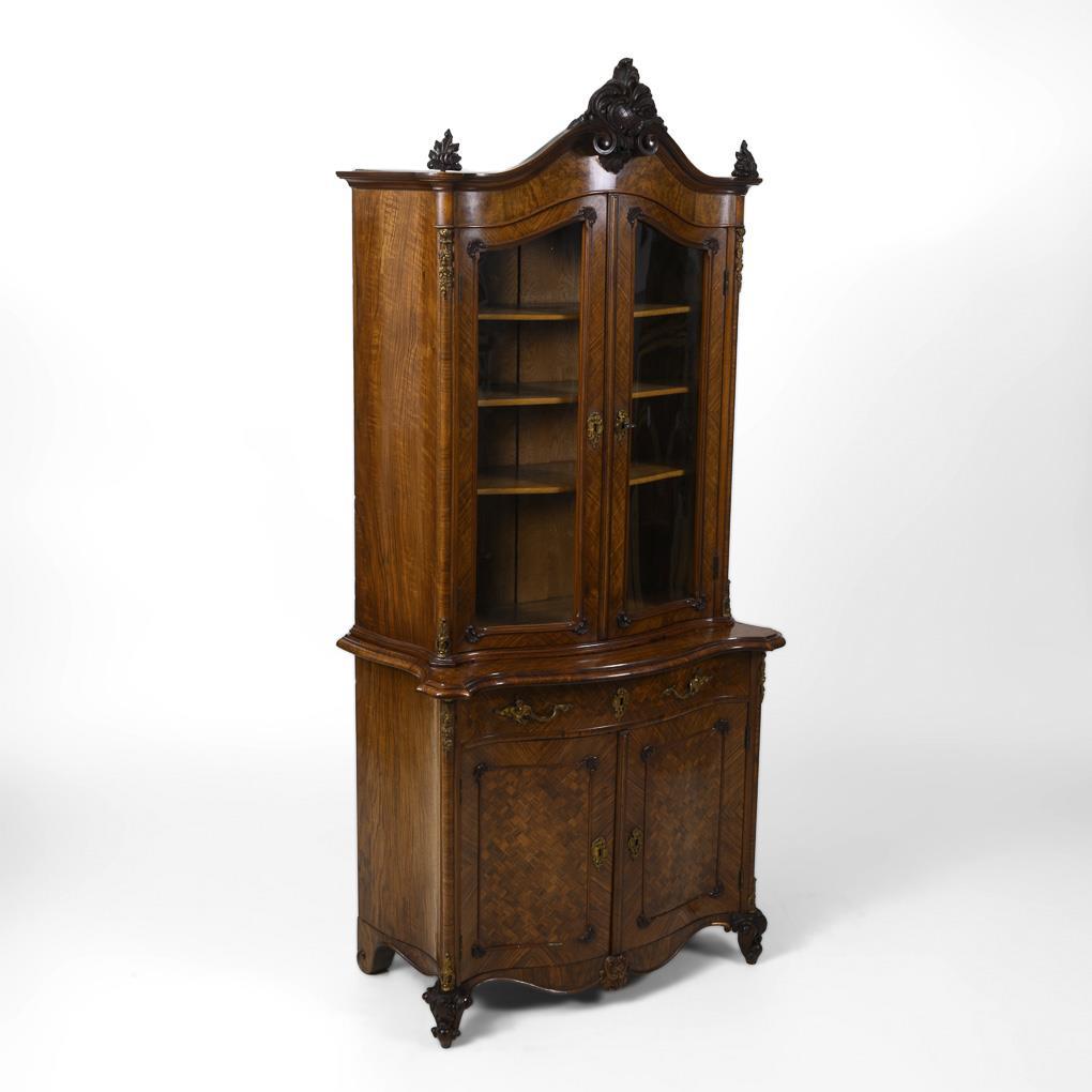 Zierlicher Vitrinenschrank mit stiltypisch geschwungenem Korpus; 2-türiges Unterteil mit Schub, frontverglaster, 2-türiger Aufsatz mit Rocaillenbekrönung aus Schnitzwerk; dekoriert mit Maserfurnier und parkettierten Kassettenfüllungen, üppige Bronze-Applikationen; Vitrine mit 3 höhenverstellbaren Einlegeböden. Leichte Alters-/Gebrauchsspuren.
