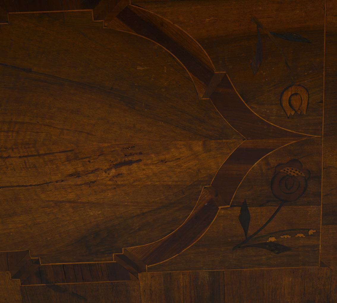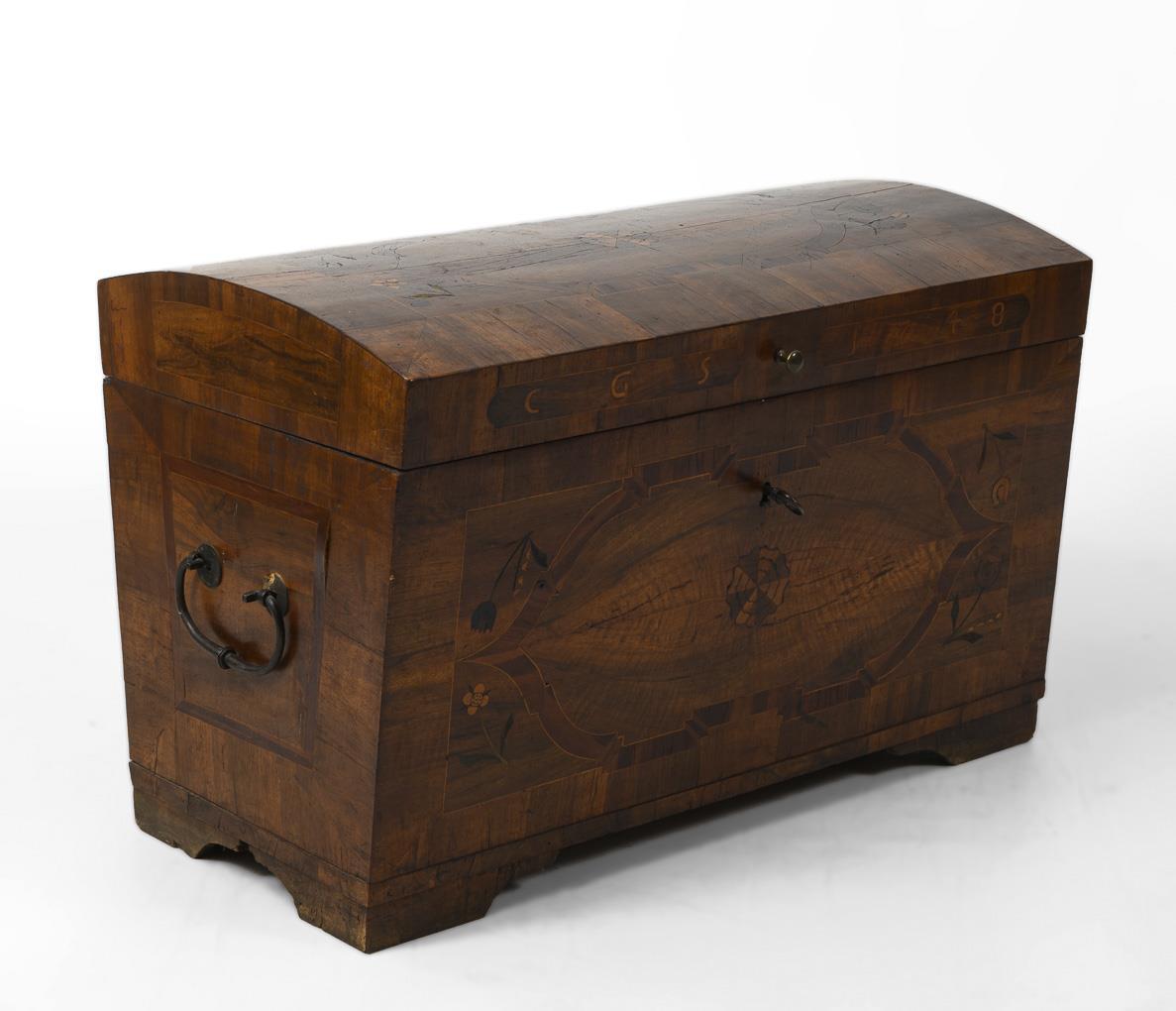 Zierliche Truhe mit stilisierten Blumenmarketerien, Rosetten und Bandelwerk, Initialen "CGS" und datiert "1748", Seitenwände mit Bügelgriffen; innen mit herausnehmbarem Wäschefach. Alters-/Gebrauchsspuren, alt restauriert, Schloss wohl ergänzt.
