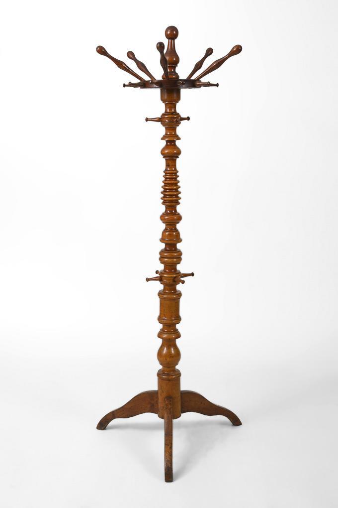 Üppig gedrechselter Gründerzeit-Kleiderstock mit drehbarer Krone und Hutablage, auf 3 leicht geschwungenen Beinen. Alters-/Gebrauchsspuren, alt restauriert, inaktiver Anobienbefall.