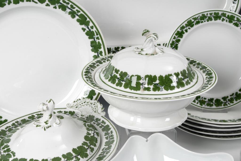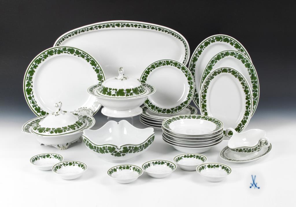 27 Teile. Form "Neuer Ausschnitt". 6 Suppenteller, 6 Speiseteller, 6 Kompottschälchen, 1 + 1 + 1 Ovalplatten, 1 Gemüseteller, 1 Fischplatte, 1 ovale und 1 runde Deckelschüssel und 1 Quadratschale. 1x Marke beschliffen.