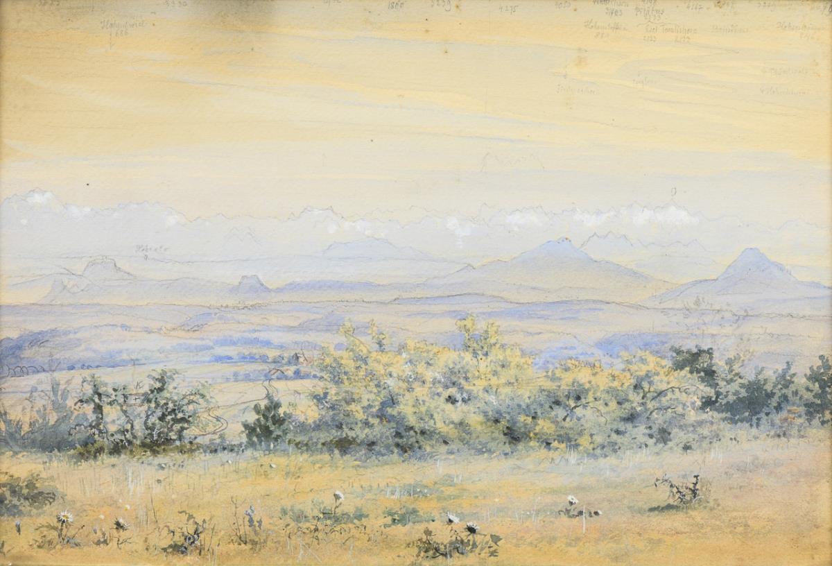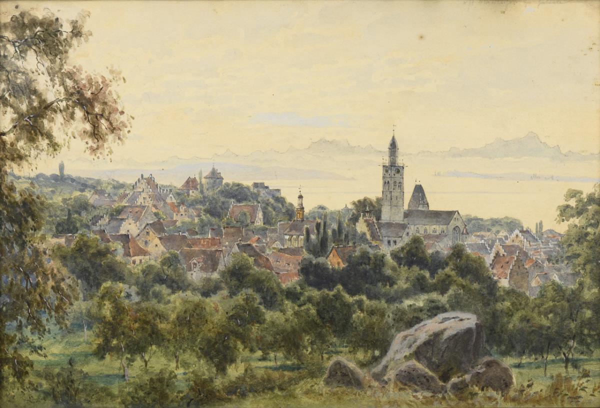 "Meersburg am Bodensee". / Stadt im Gebirge. / Alpenpanorama mit Bleistiftnotizen am oberen Rand (Hohenstoffeln, Wetterhorn, Schreckhorn usw.). Leicht gebräunt, 2x etwas fleckig/eingestaubt.