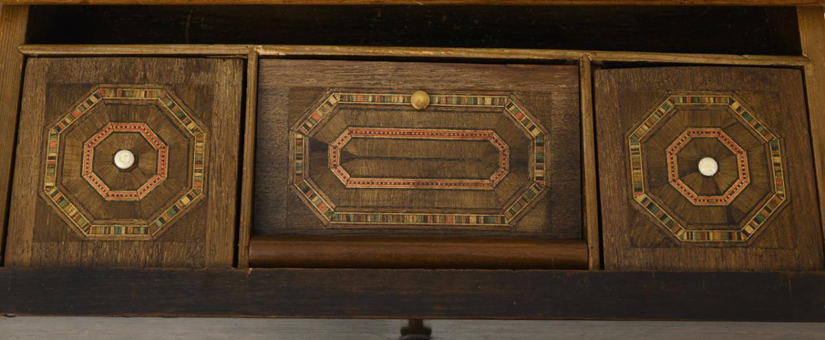 2-schübiger, rechteckiger Nähtisch auf gedrechselter Mittelstütze mit 3 geschweiften Füßen; oberer Schub mit 3 kleinen Fächern mit fein verzierten Holzdeckeln und 1 offenen Fach; verziert mit Maser- und Spiegelfurnier. Alters-/Gebrauchsspuren, Furnier mit kleinen Defekten, Mittelstütze mit Trockenriss.