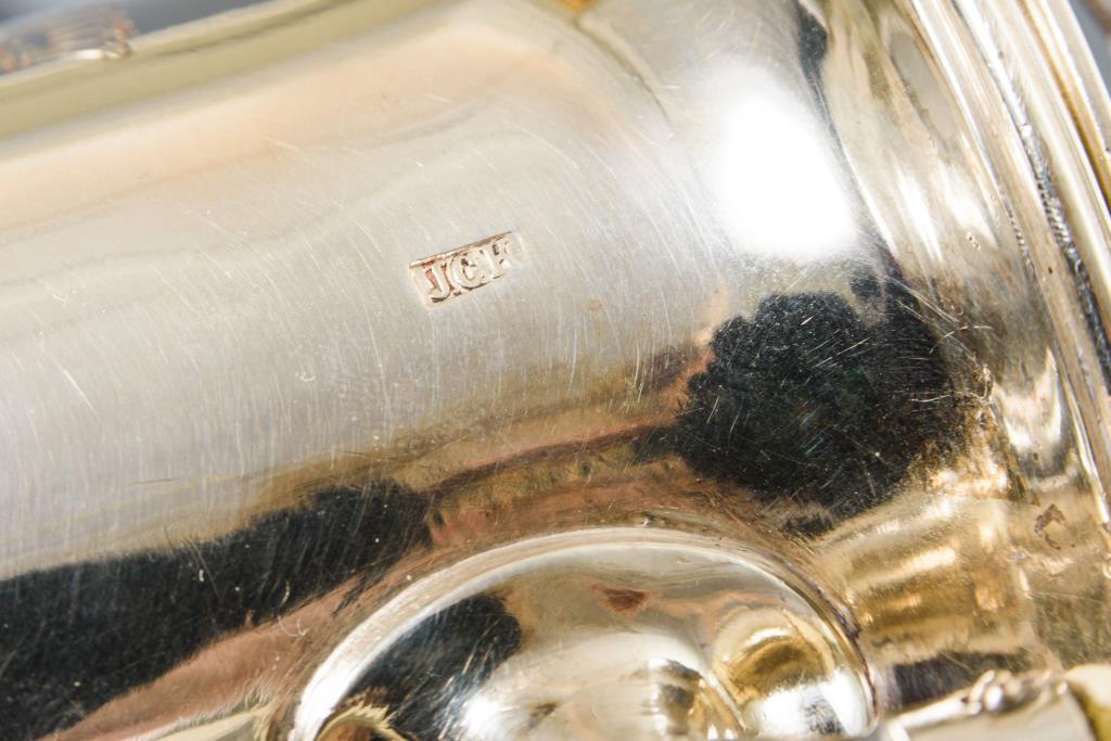 Bauchig-gedrückte Form. Mokkakanne mit Blütenknauf. Kanne, Kännchen und Zuckerschale mit bekrönter Monogrammgravur "OGS". Gebrauchsspuren, kleine Dellen.