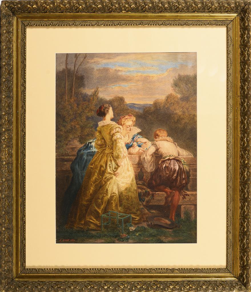 Zwei edle Damen in prunkvollen Kleidern mit einem Jungen bei einer Brieftaube in einer Parklandschaft. Leichte Altersspuren.