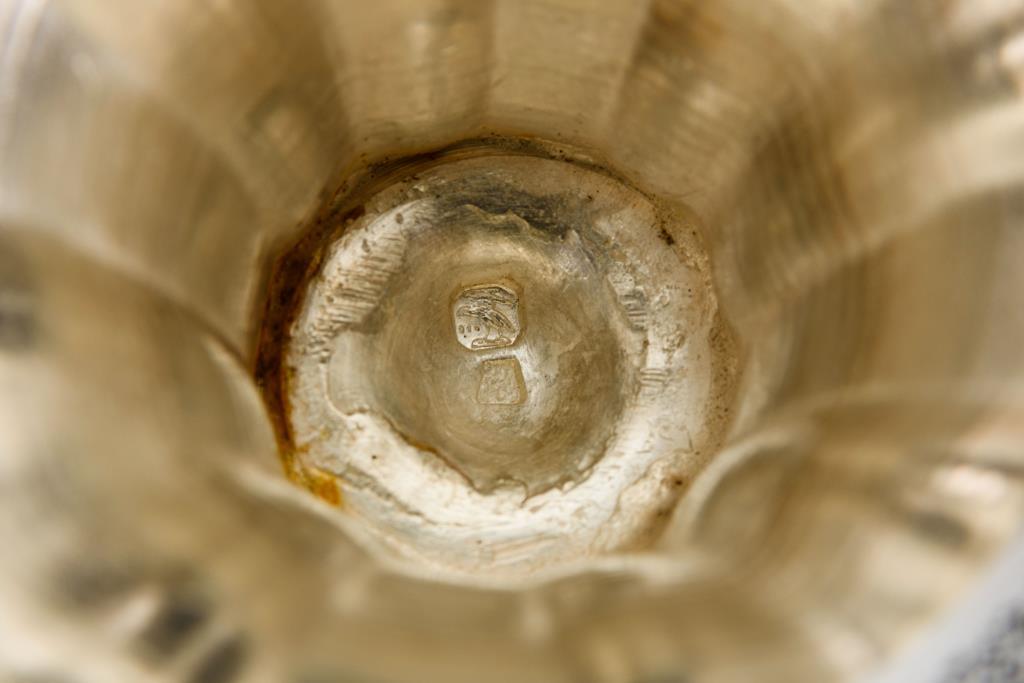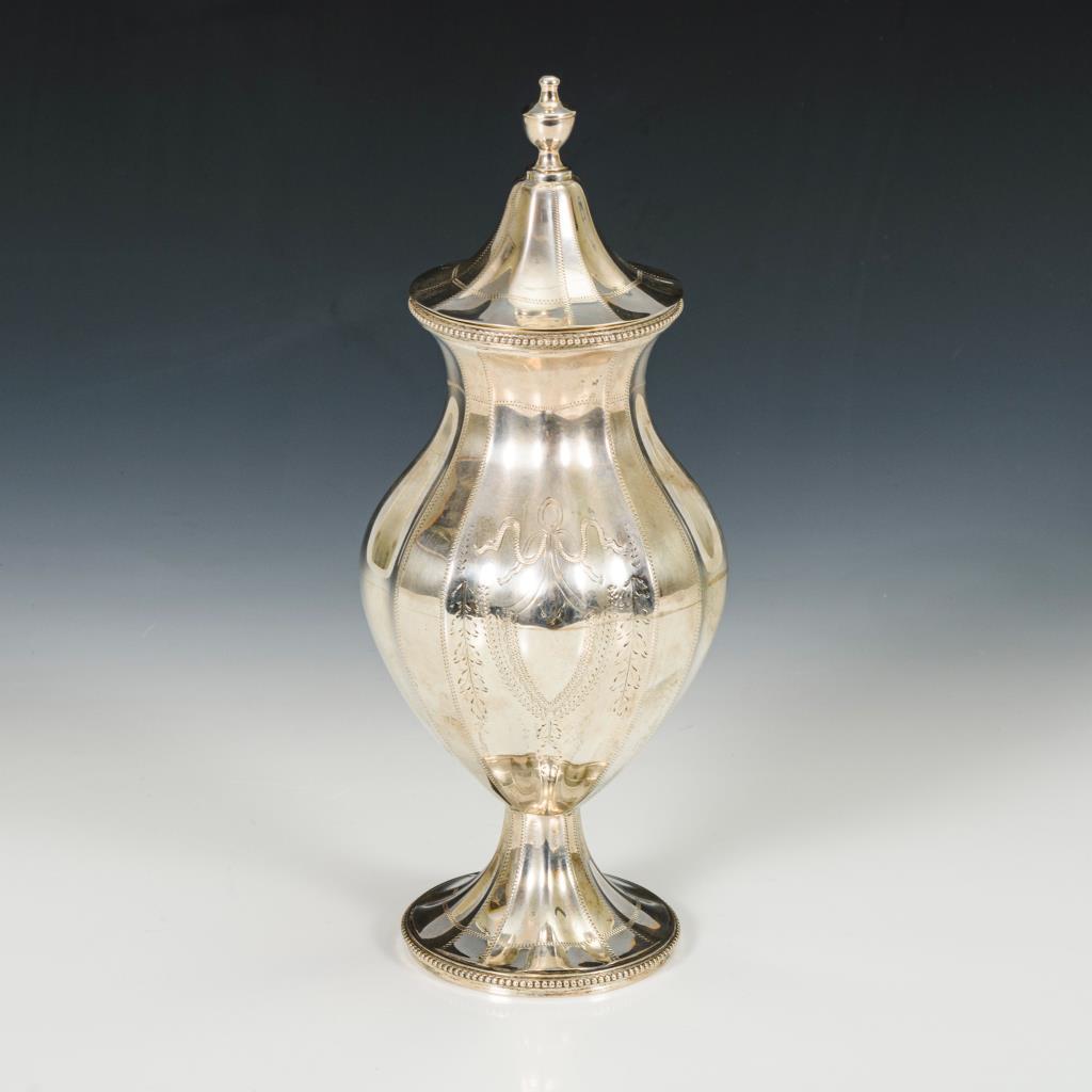 Balusterform mit feinen Gravuren und Perlrand. Deckel gedellt.