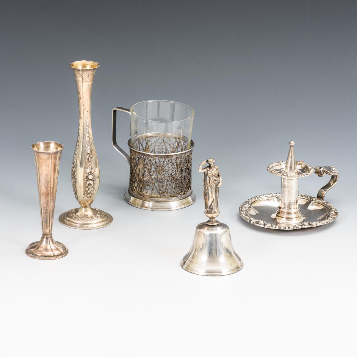 Reliefiertes Väschen, Teeglashalter mit ergänztem Glas, WMF-Väschen, Kerzenhalter mit Löscher und Glocke mit Athena-Figur.