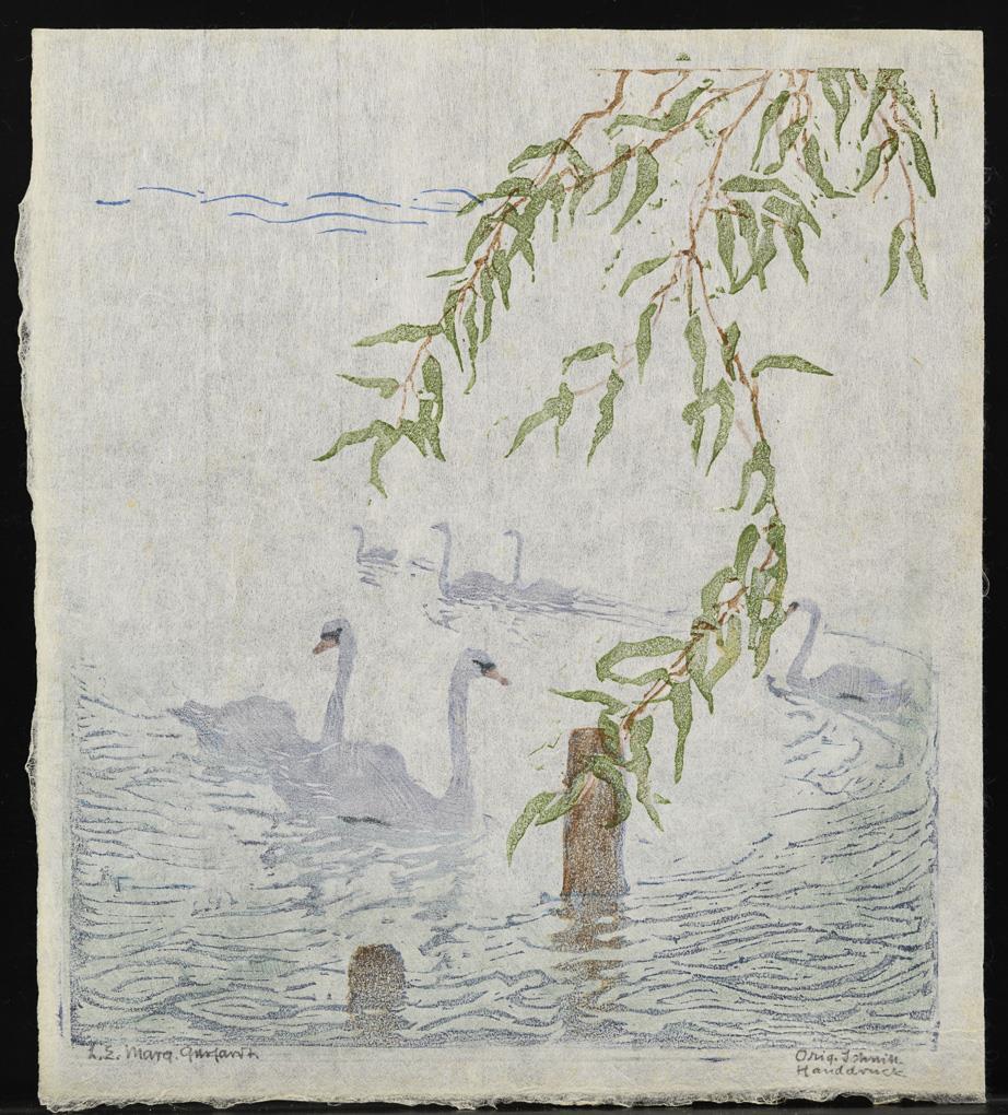 Farbholzschnitt auf Japanpapier. Bleistiftsignatur. "Original-Holzschnitt - Handdruck".