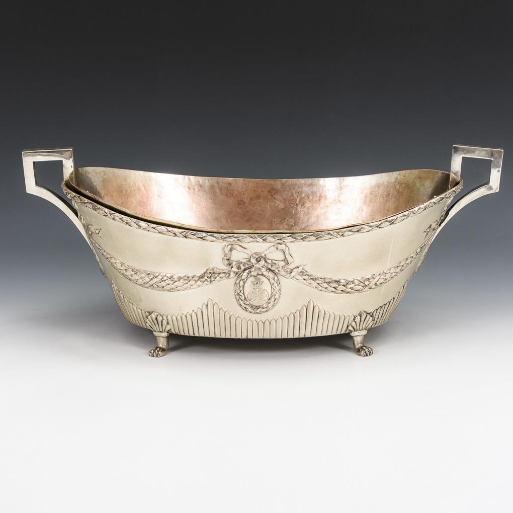 Ovaler Sektkühler mit Girlandenzier und 2 gewinkelten Henkeln. Schauseitig kleines, graviertes Allianzwappen der Familien von der Galentz und von Helldorf. Mit herausnehmbarem Kupfereinsatz. Gebrauchsspuren.